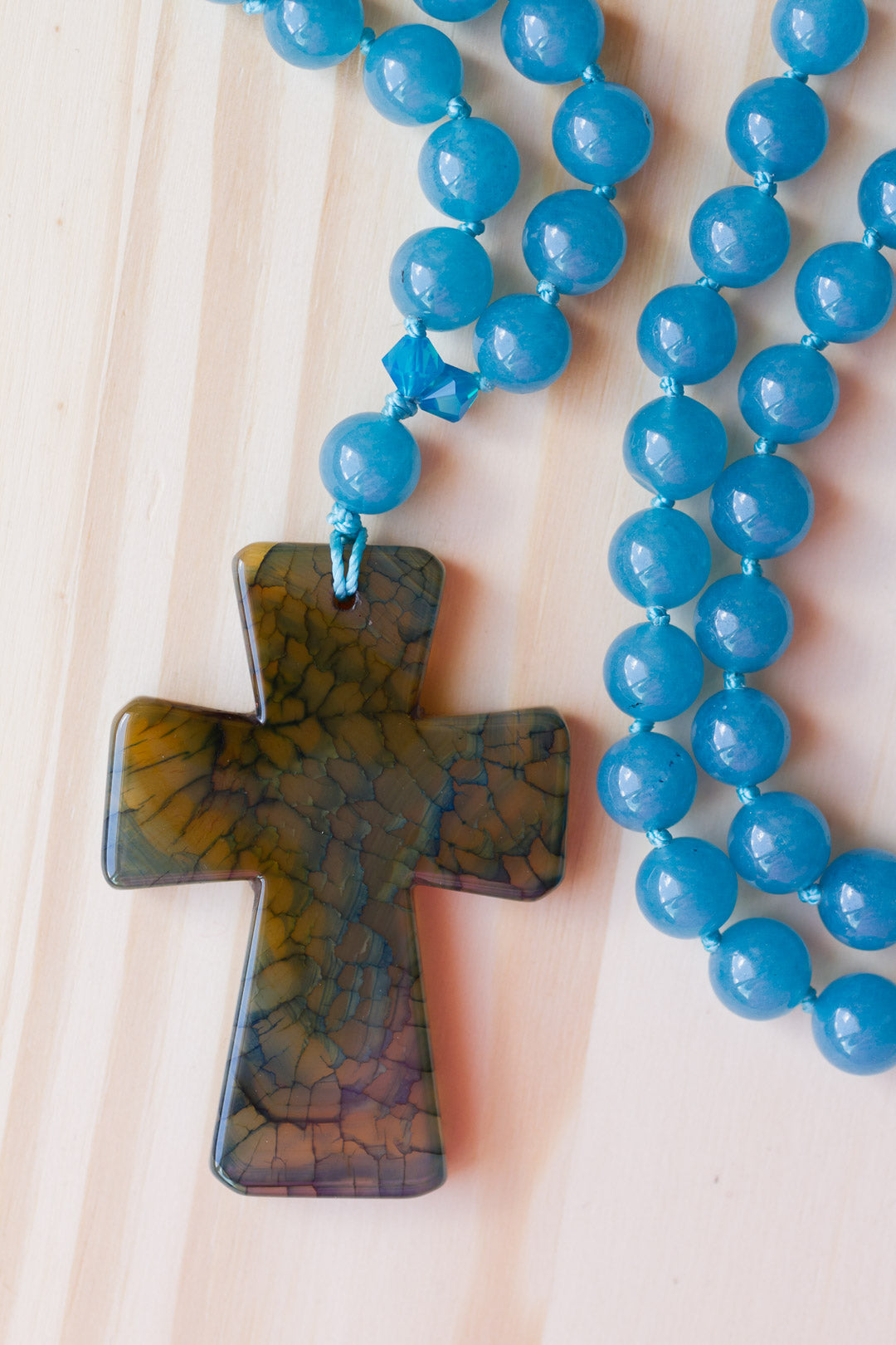 28" Long Dragon Vein Agate Cross Pendant Necklace with Angelite Beads