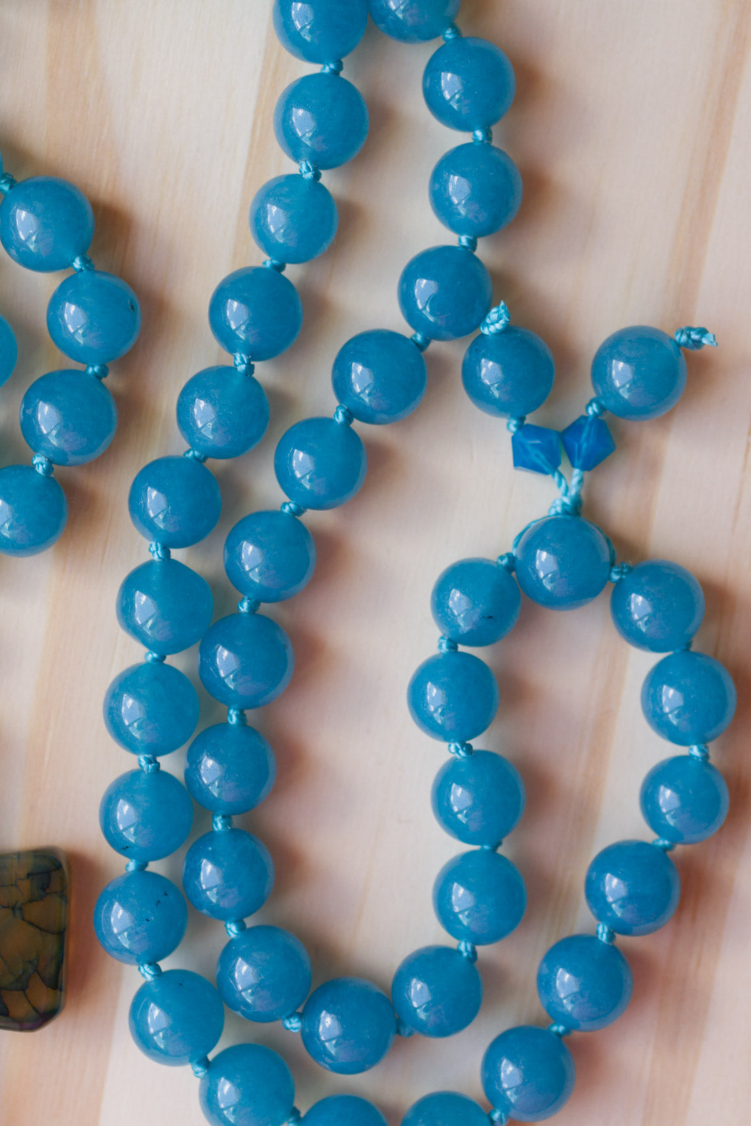It is hand knotted on a turquoise color nylon cord. The beads are a beautiful 10mm teal/blue colored angelite stone, and accented with a few swarovski crystal beads.