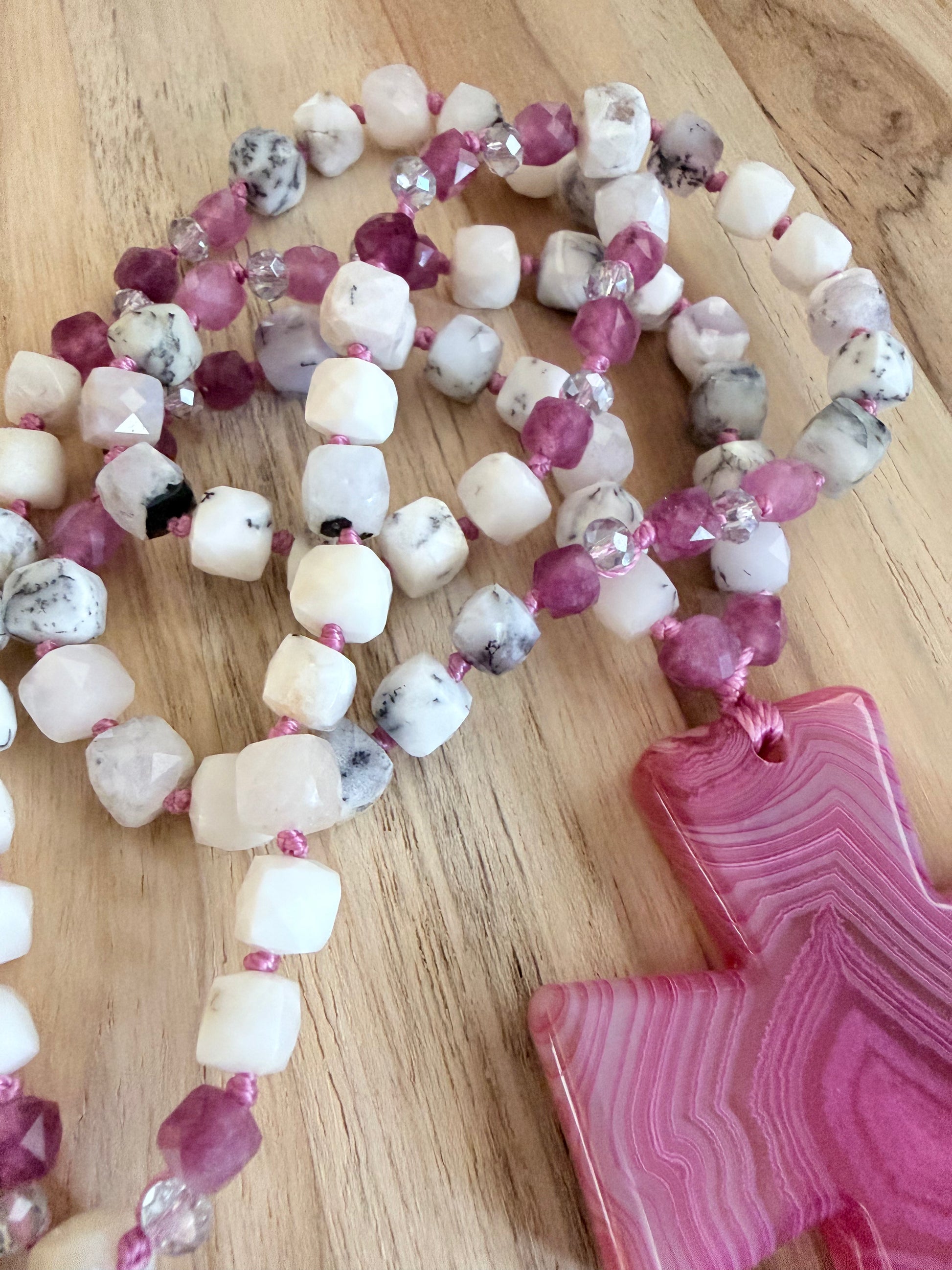 26” Long Wraparound Pink Agate Cross Beaded Necklace with Peristerite Moonstone and Pink Tourmaline Beads
