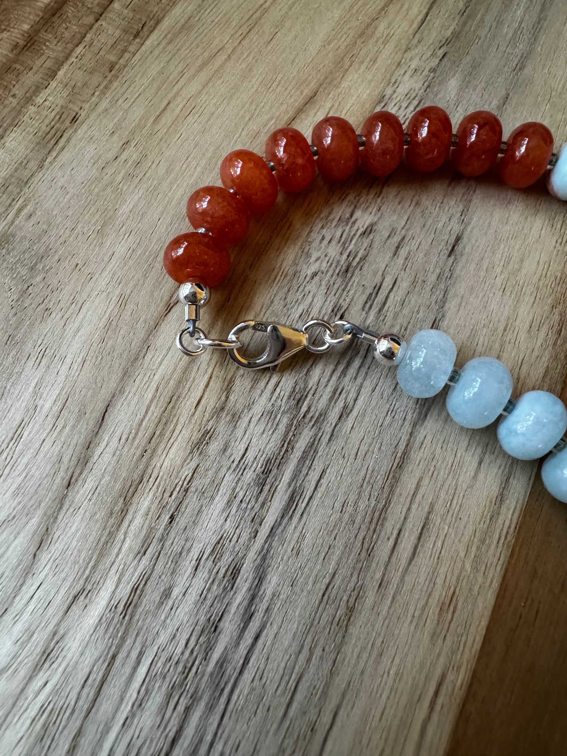 Gemstones include Pink aventurine, jade (dyed), and light blue aqua terra jasper. Amazing blend of colors! Blues, rust orange and peach!