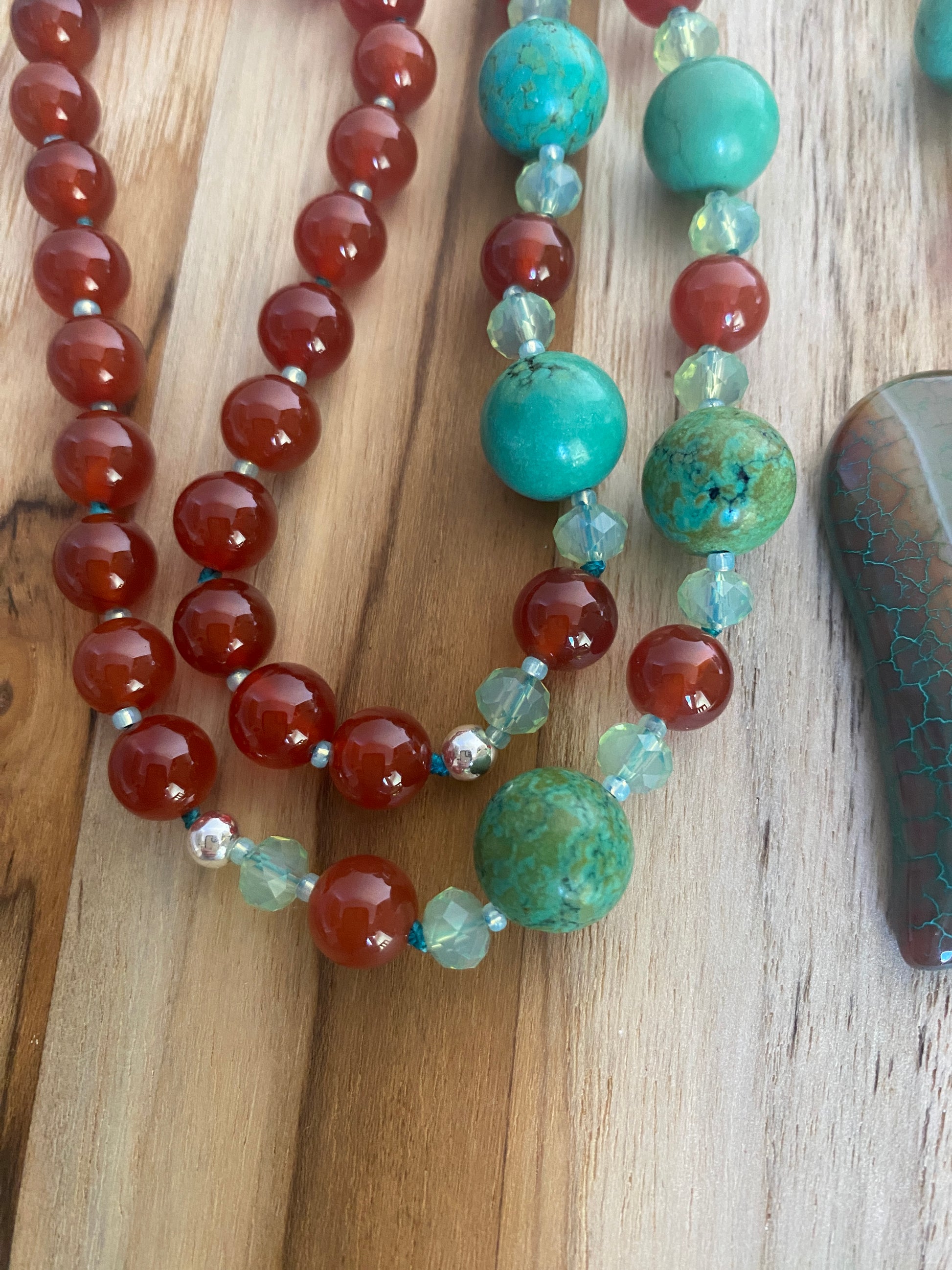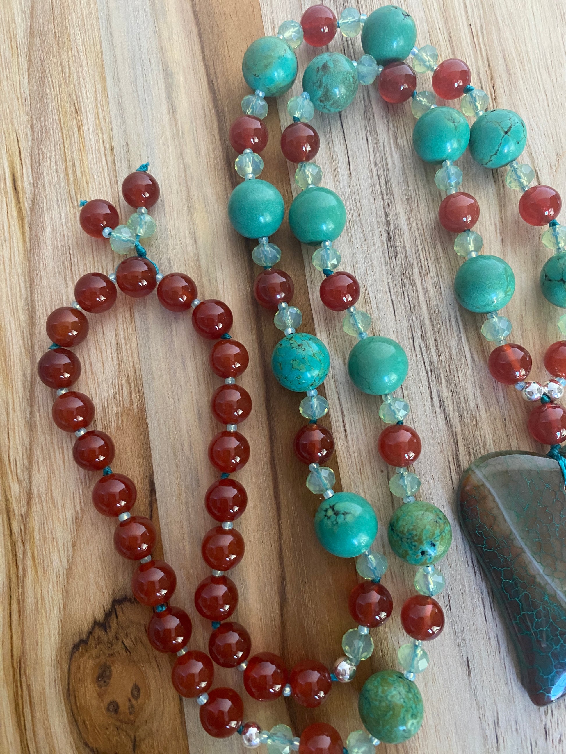 The stunning focal piece is a dragon vein agate heart in shades of brown and green. I have accented this focal piece with 12mm green turquoise, 8mm carnelian, 6mm green crystals, and a hint of silver with 5mm silver plated hematite beads.