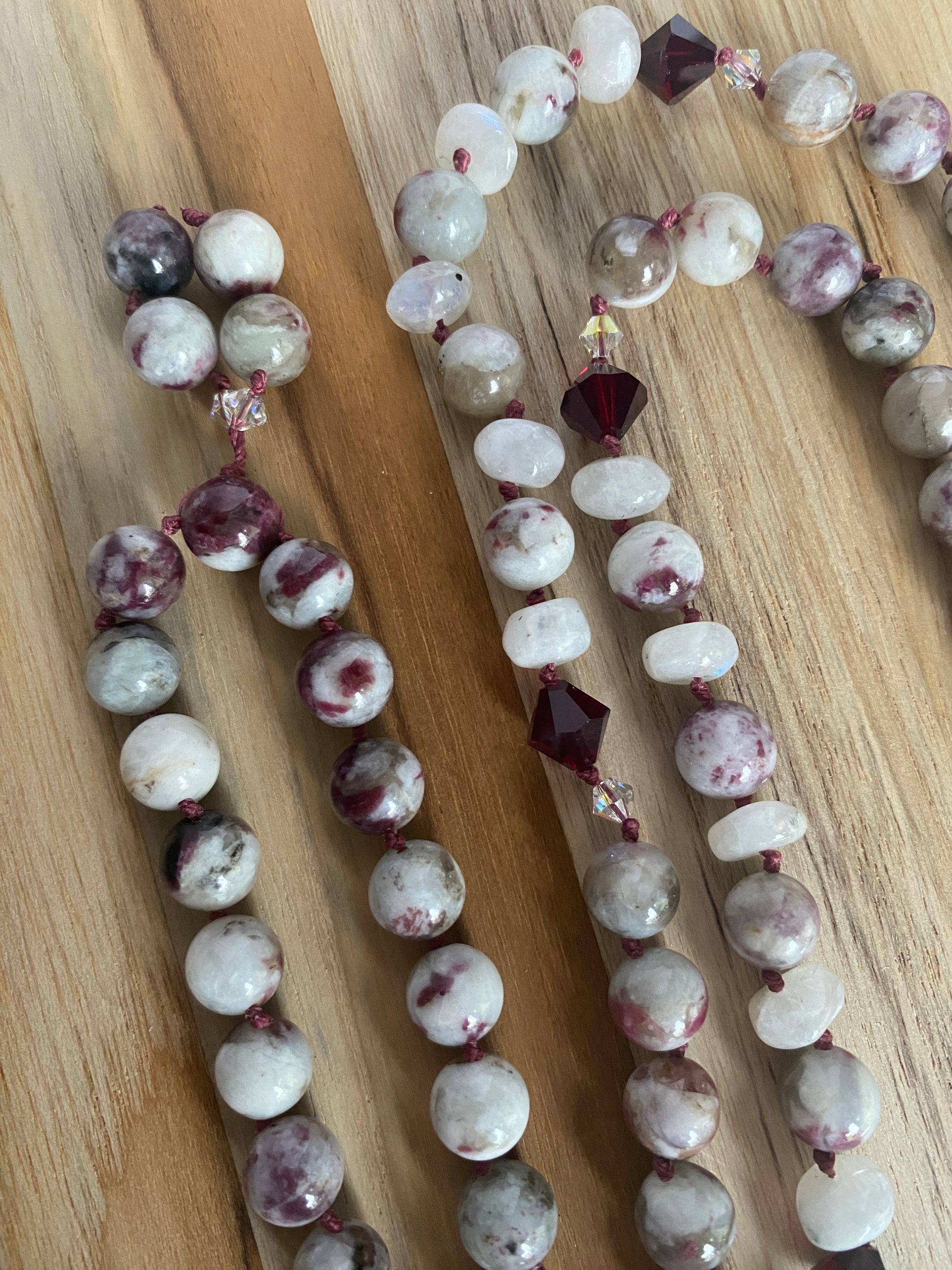 This gorgeous mother of pearl shell wing is a beautiful white pearlised color, and it measures approx. 2.75" in length. This long necklace is individually hand knotted with beautiful 8mm round pink flower tourmaline beads, 8mm moonstone rondelles, and is accented with garnet colored and clear crystal Swarovski crystal beads.