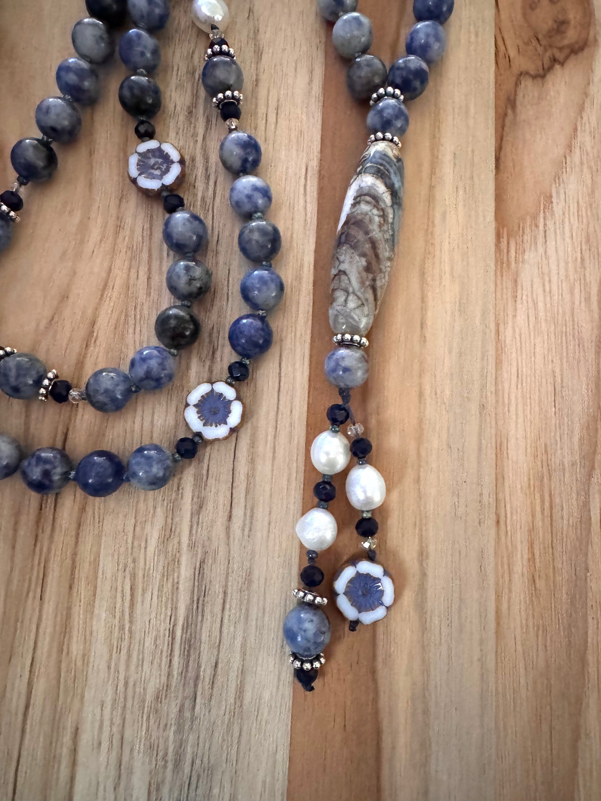Agate Column Beaded Dangle Boho Necklace with Blue Spot Jasper, Pearls and Glass Beads