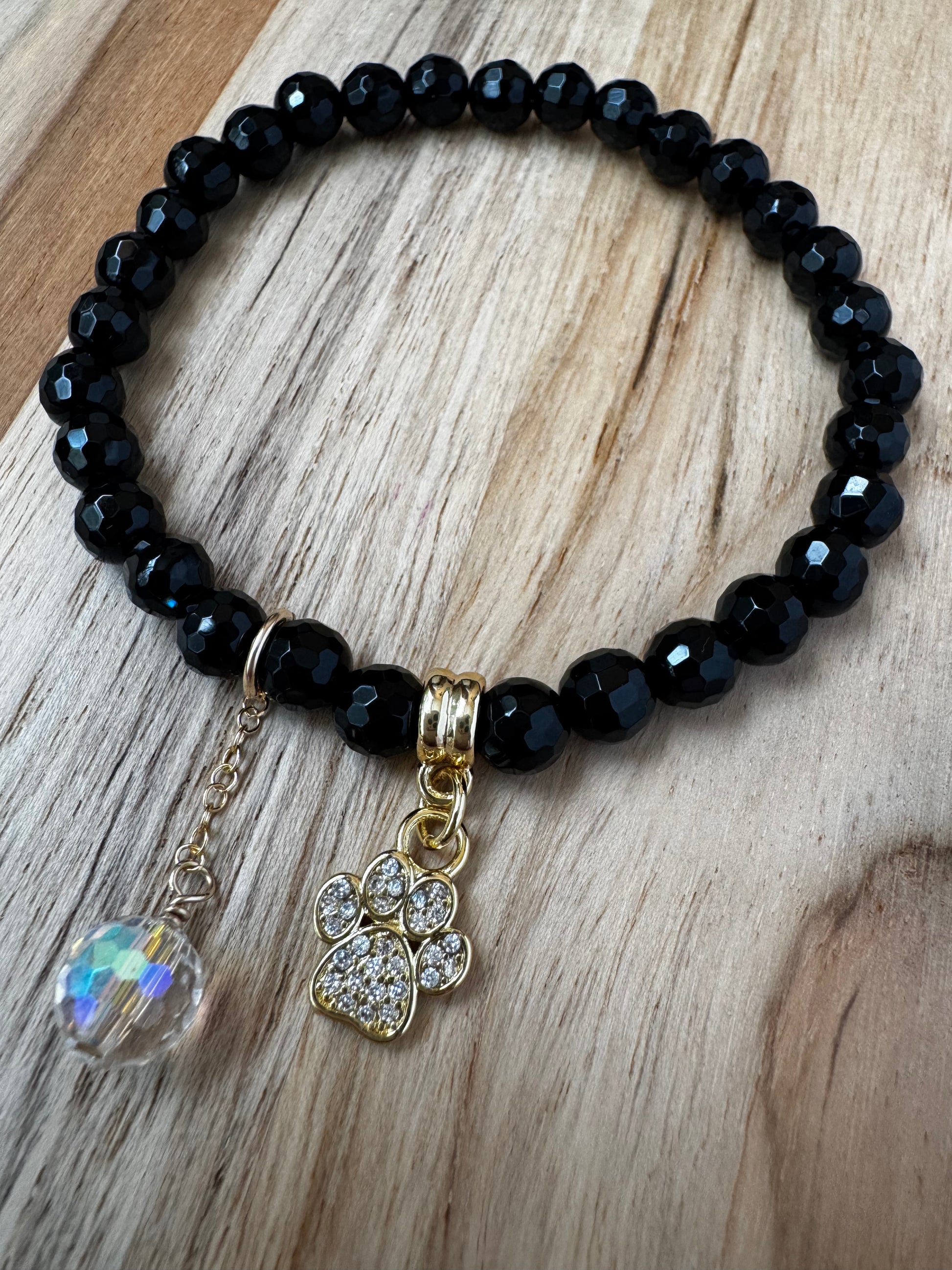 Dainty Faceted Black Onyx Stretch Bracelet with Paw and Crystal Charms