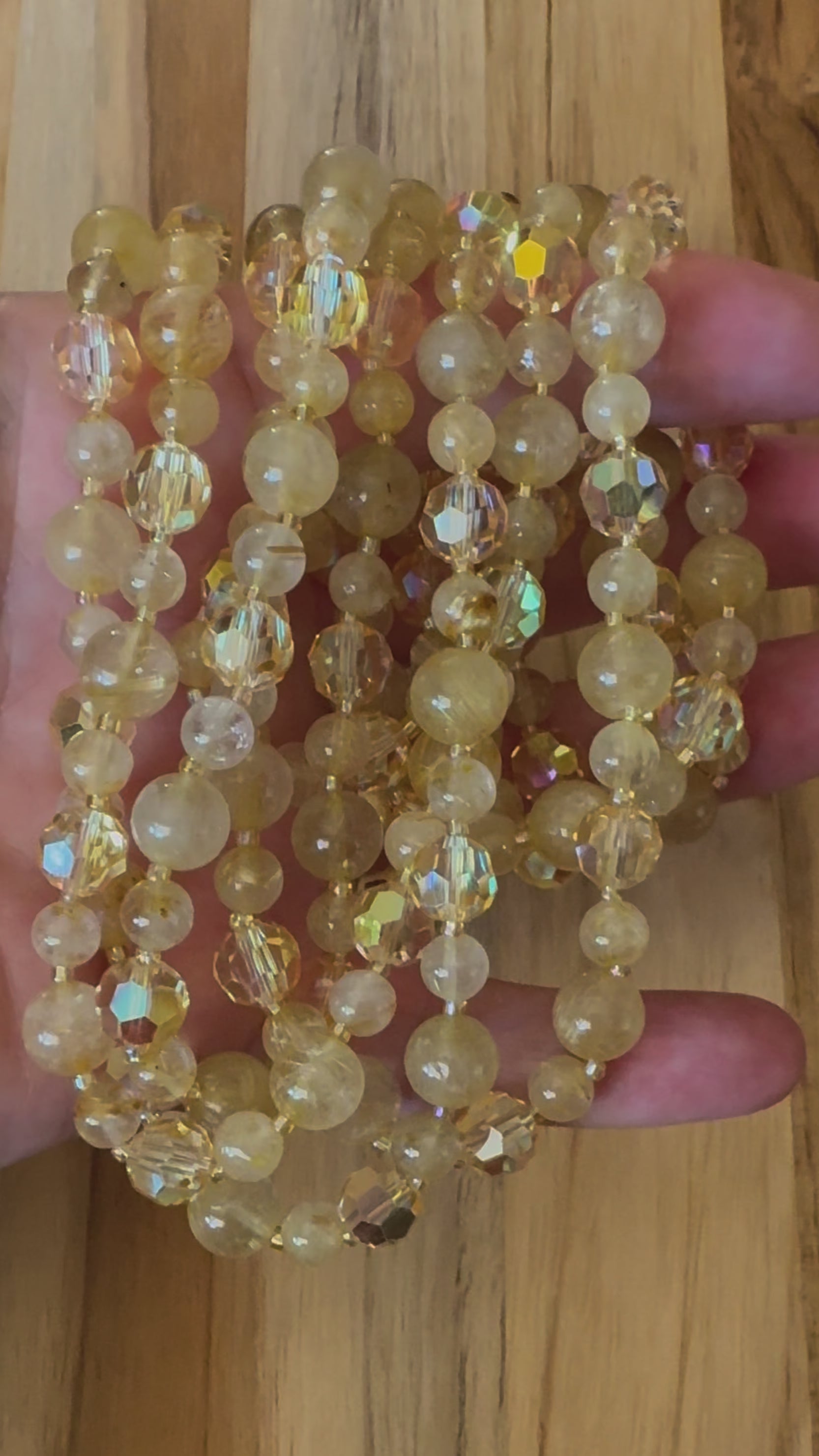 Extra Long Gold Rutilated Quartz Wraparound Style Necklace with Yellow Crystal Beads