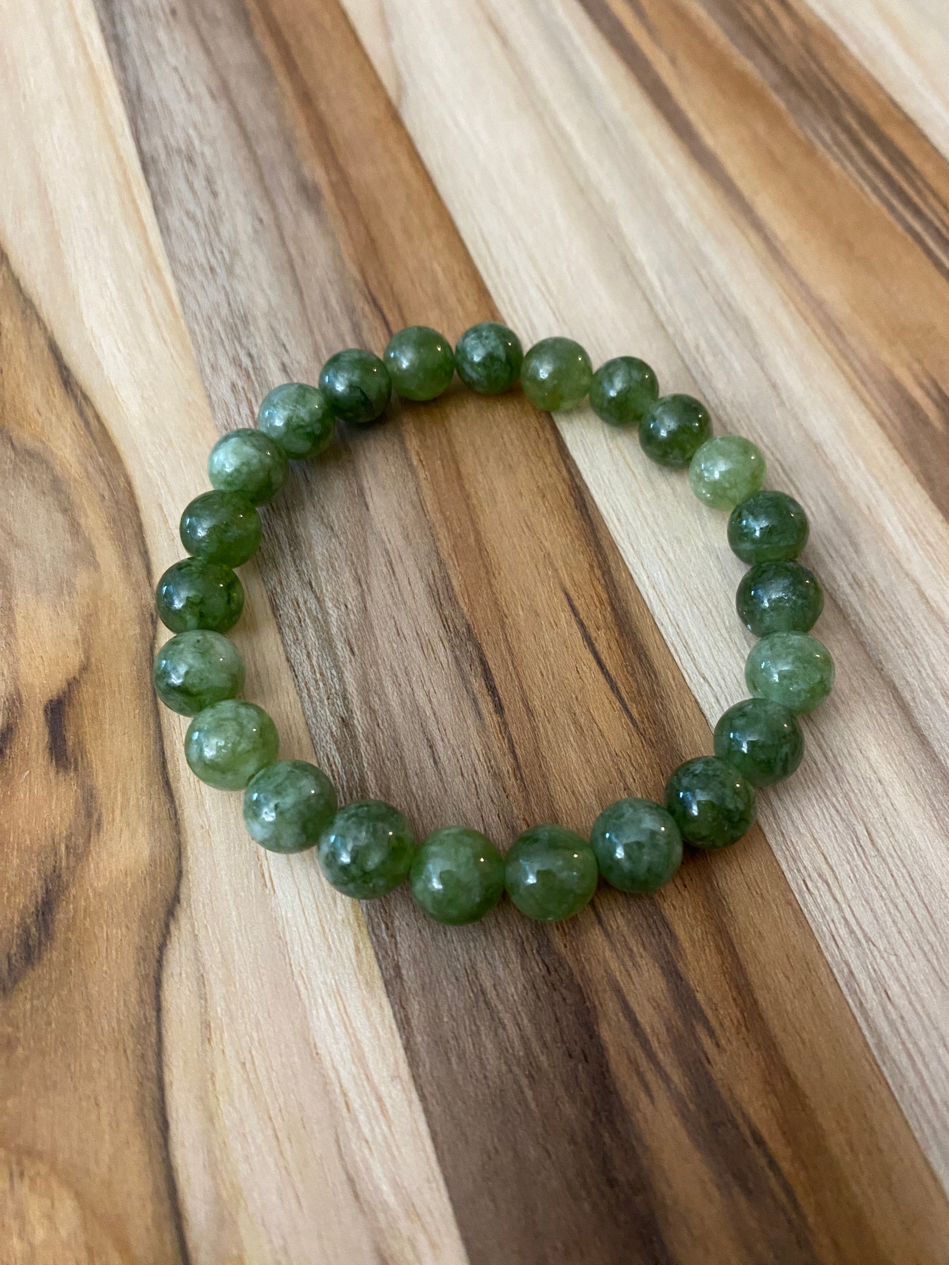 This bracelet is strung with 8mm smooth round green jade beads. It would be great worn by itself or layered with other bracelets. It would also go perfectly with your gold or silver chain jewelry.