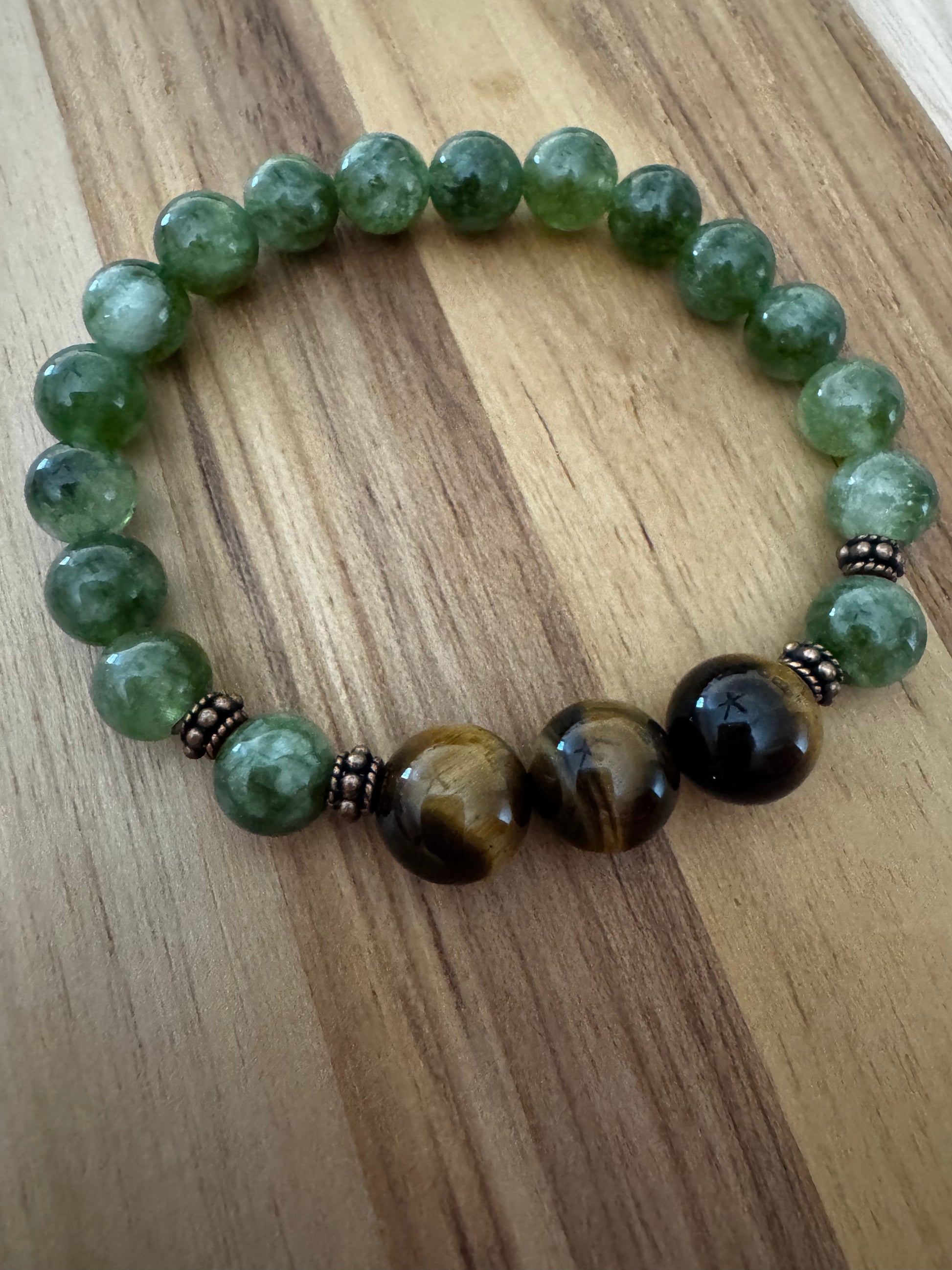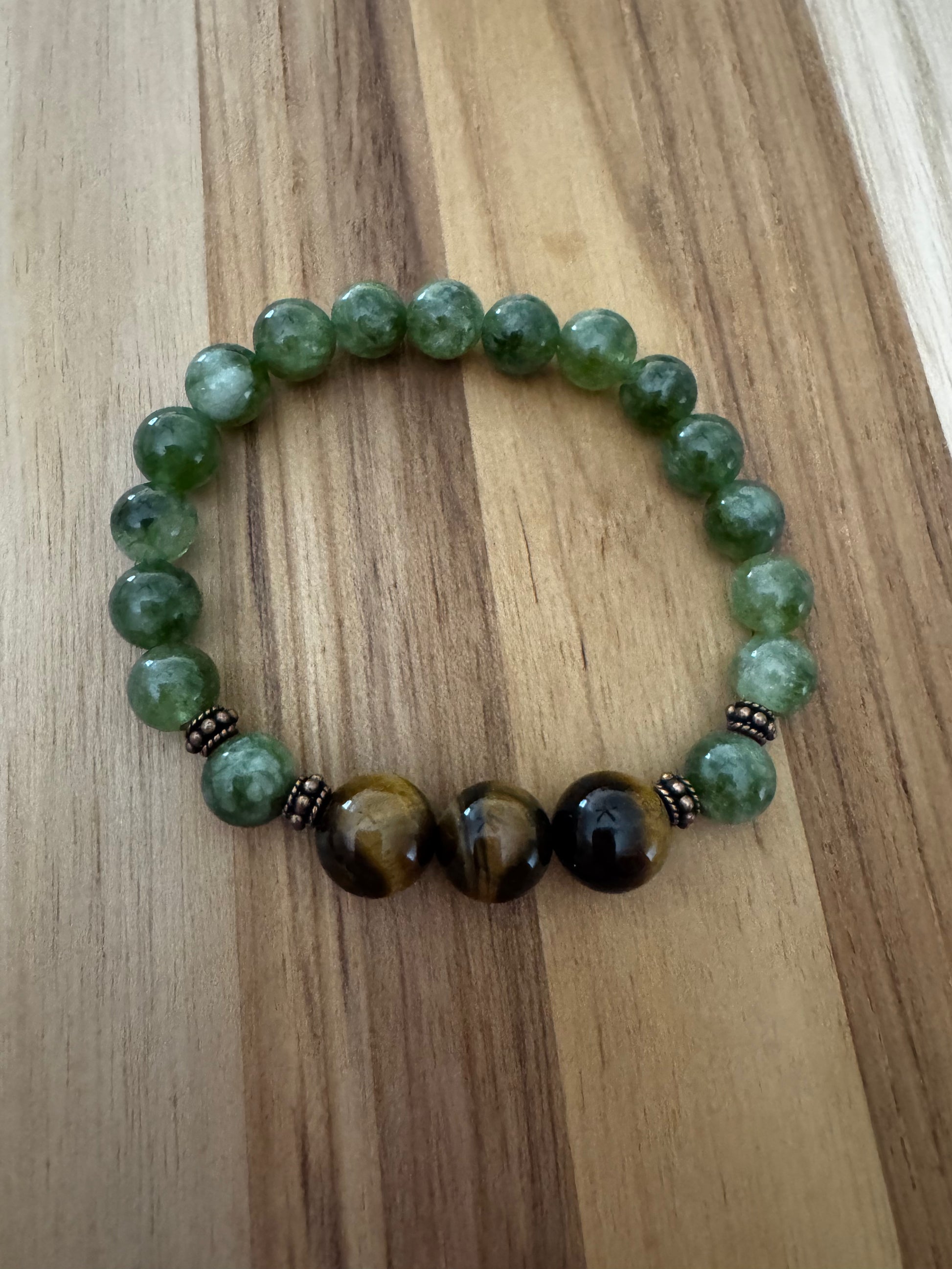 This beautiful stretch bracelet is made with 8mm green jade beads, and 10mm tigereye beads. It is accented with copper spacer beads.