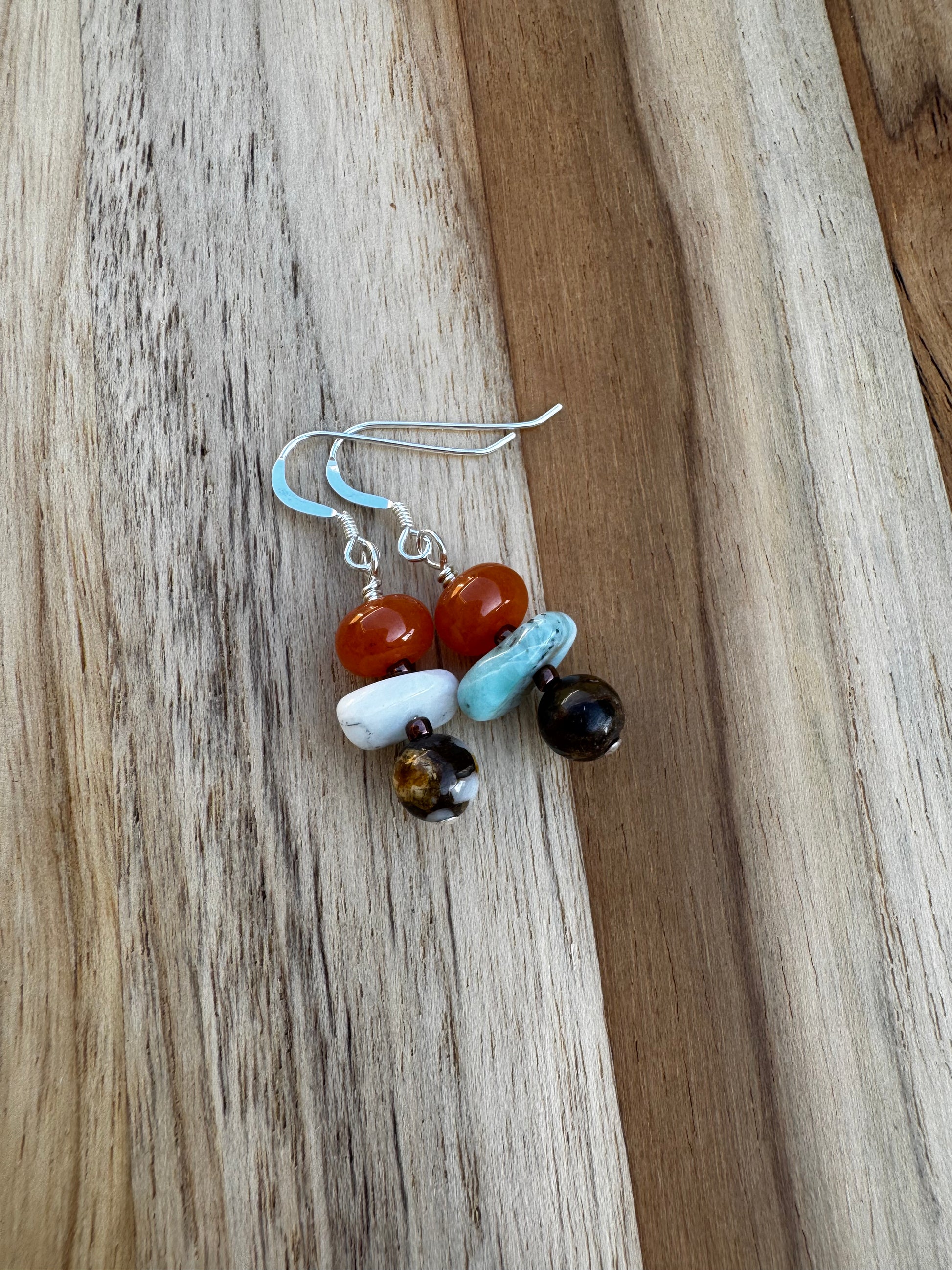 Beautiful boho style dangle earrings with Larimar, 8mm orange jade (dyed), and 6mm brown fire lace opal jasper beads.