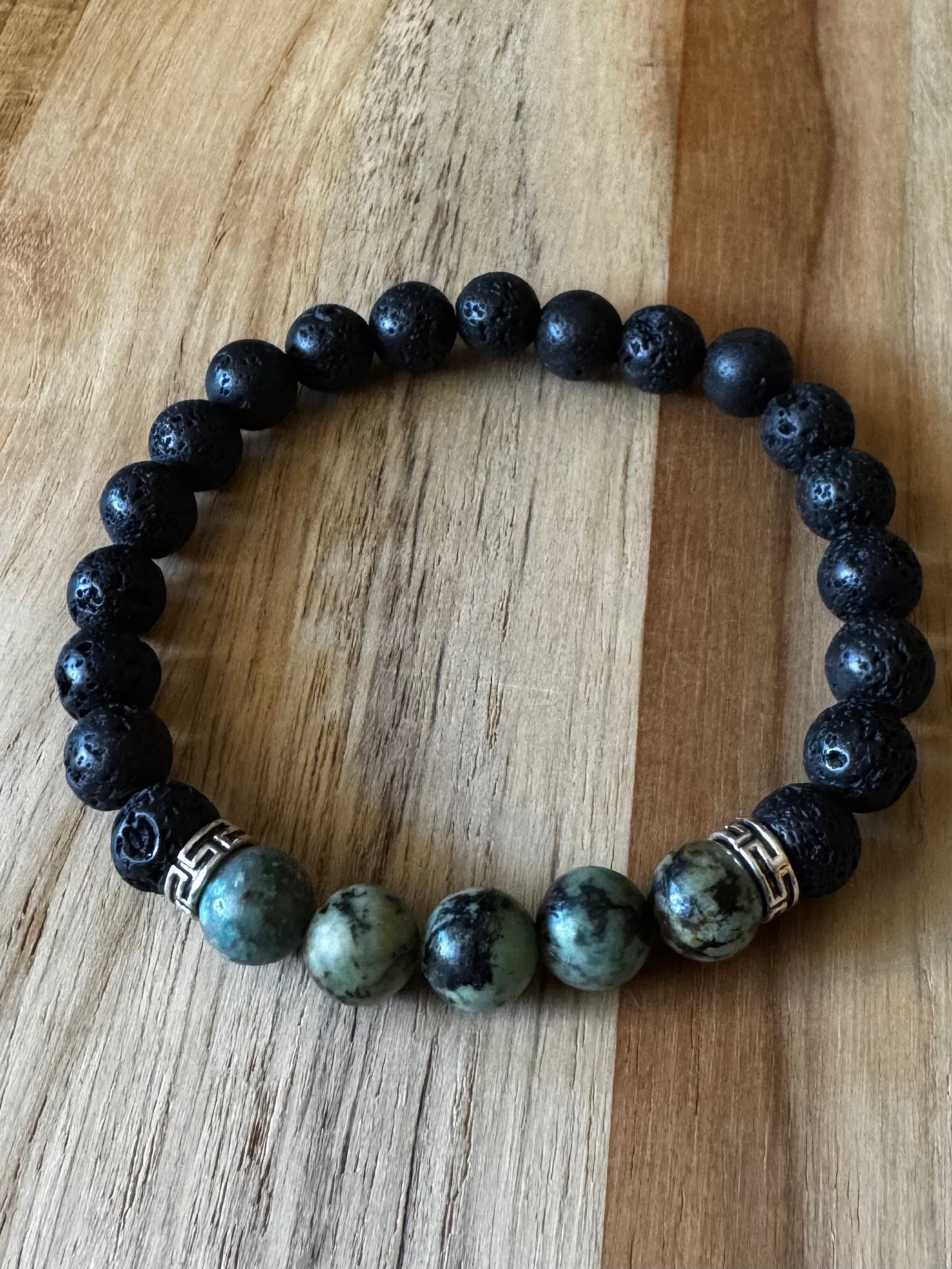 Men’s/Unisex Stretch Bracelet with Black Lava Stone & African Turquoise Beads ~ 7.5”
