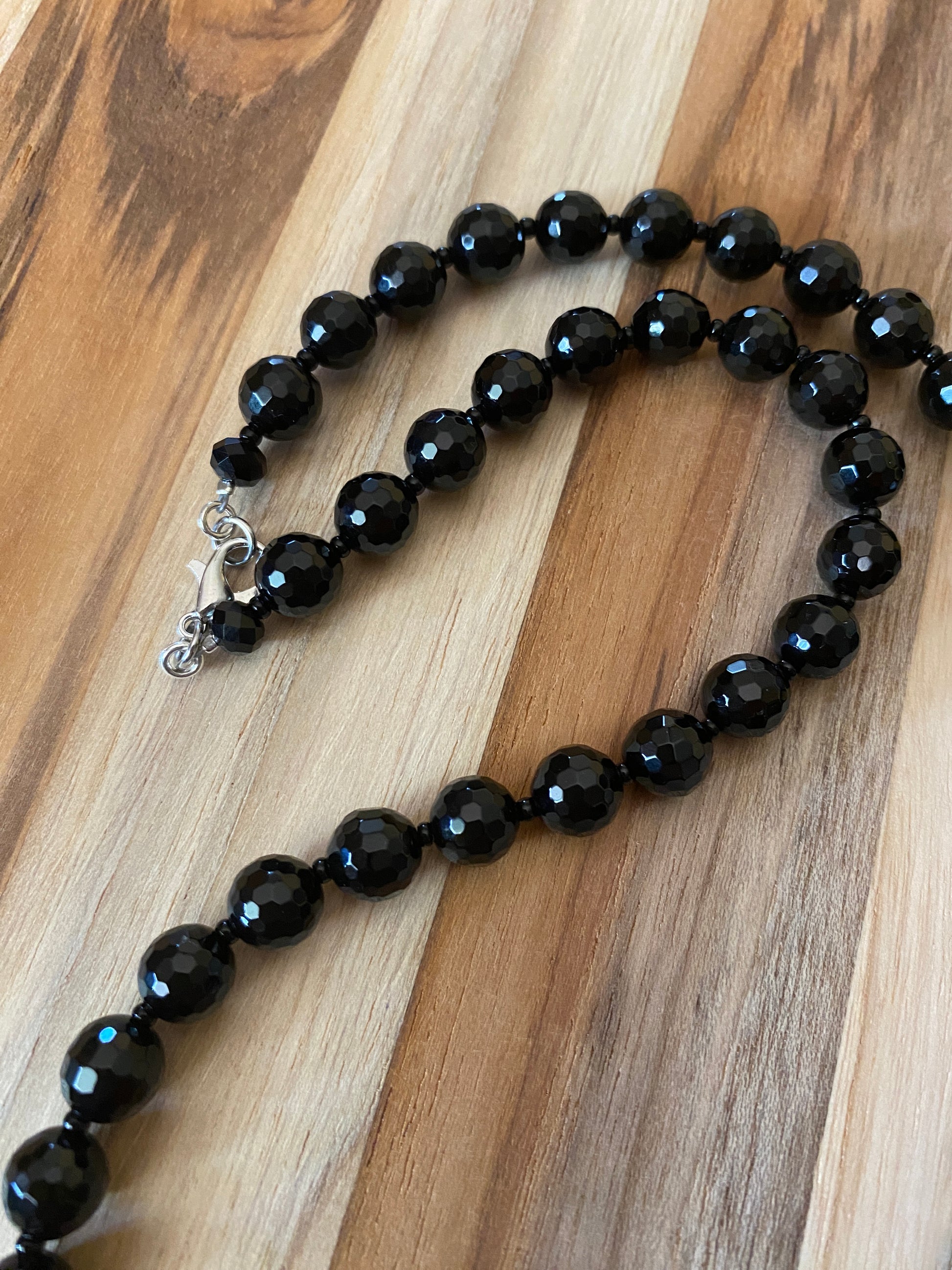 This simple basic black necklace is approx. 18” in length, and is made with 8mm multi faceted black onyx beads.