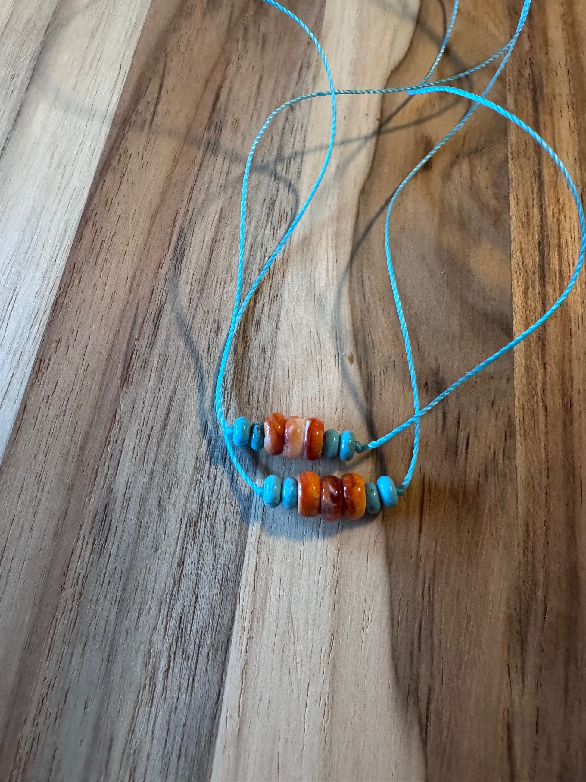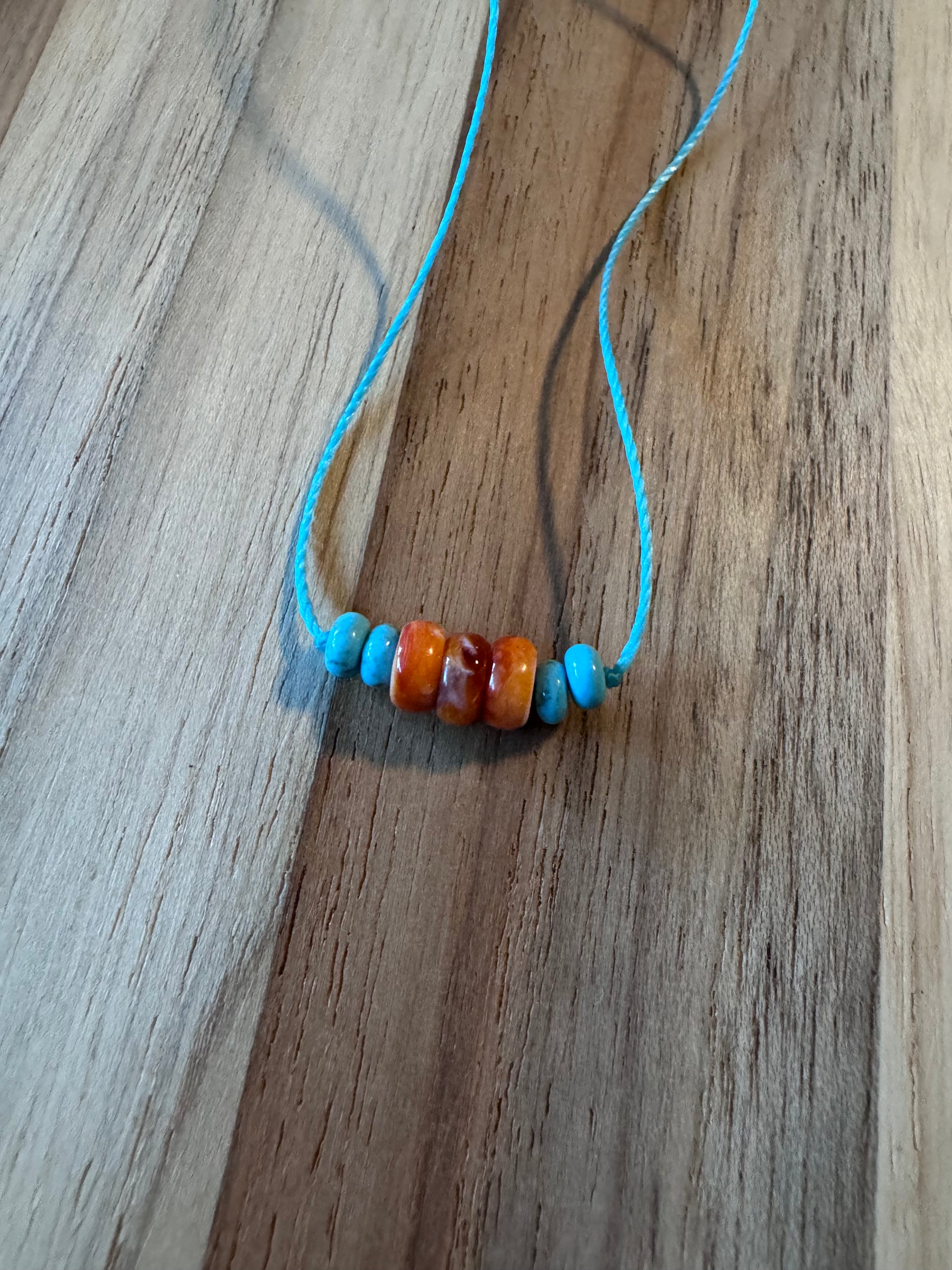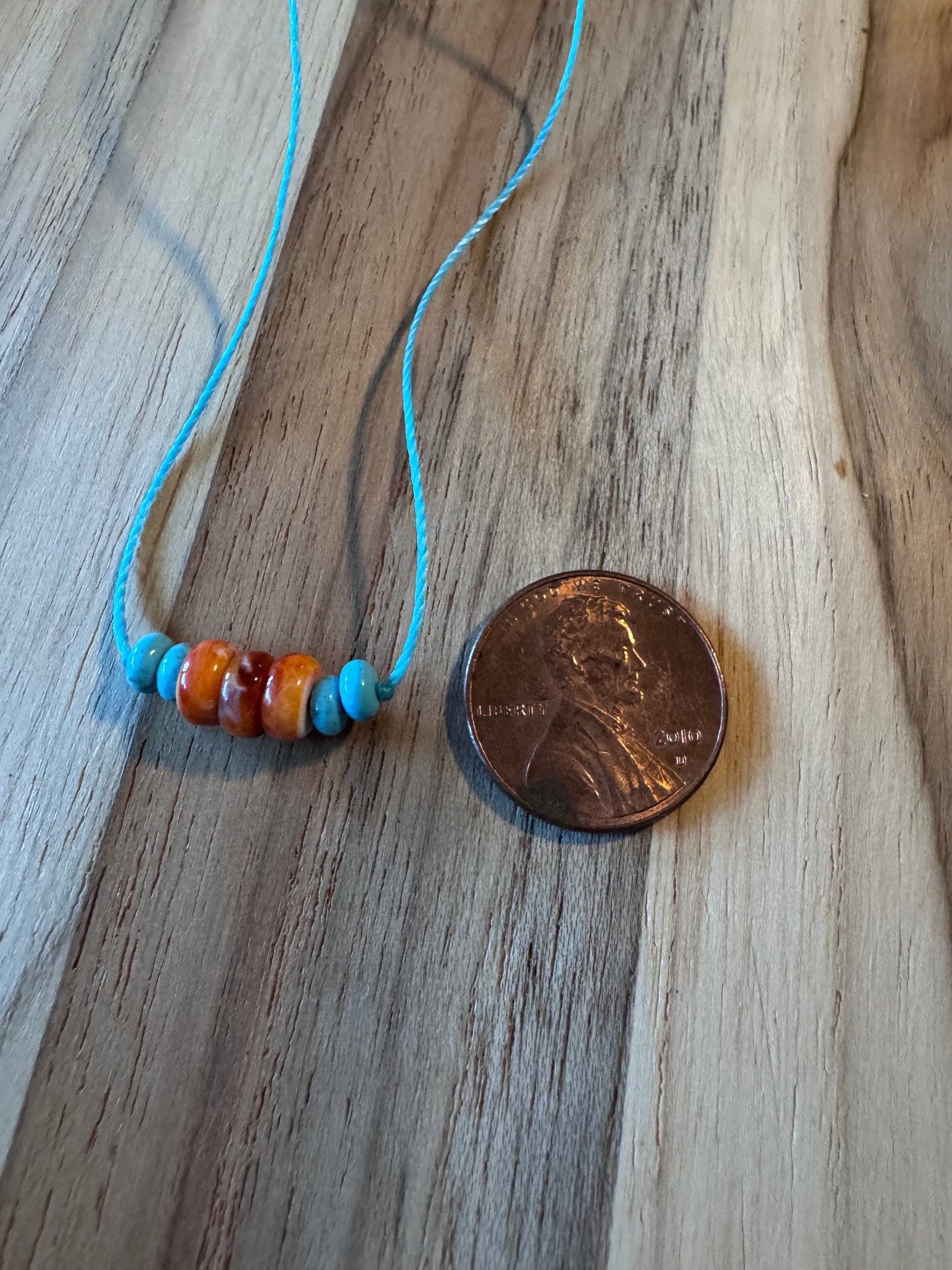 Dainty 6mm orange spiny oyster and 4mm Nevada turquoise beaded floating necklace with stainless steel clasp.