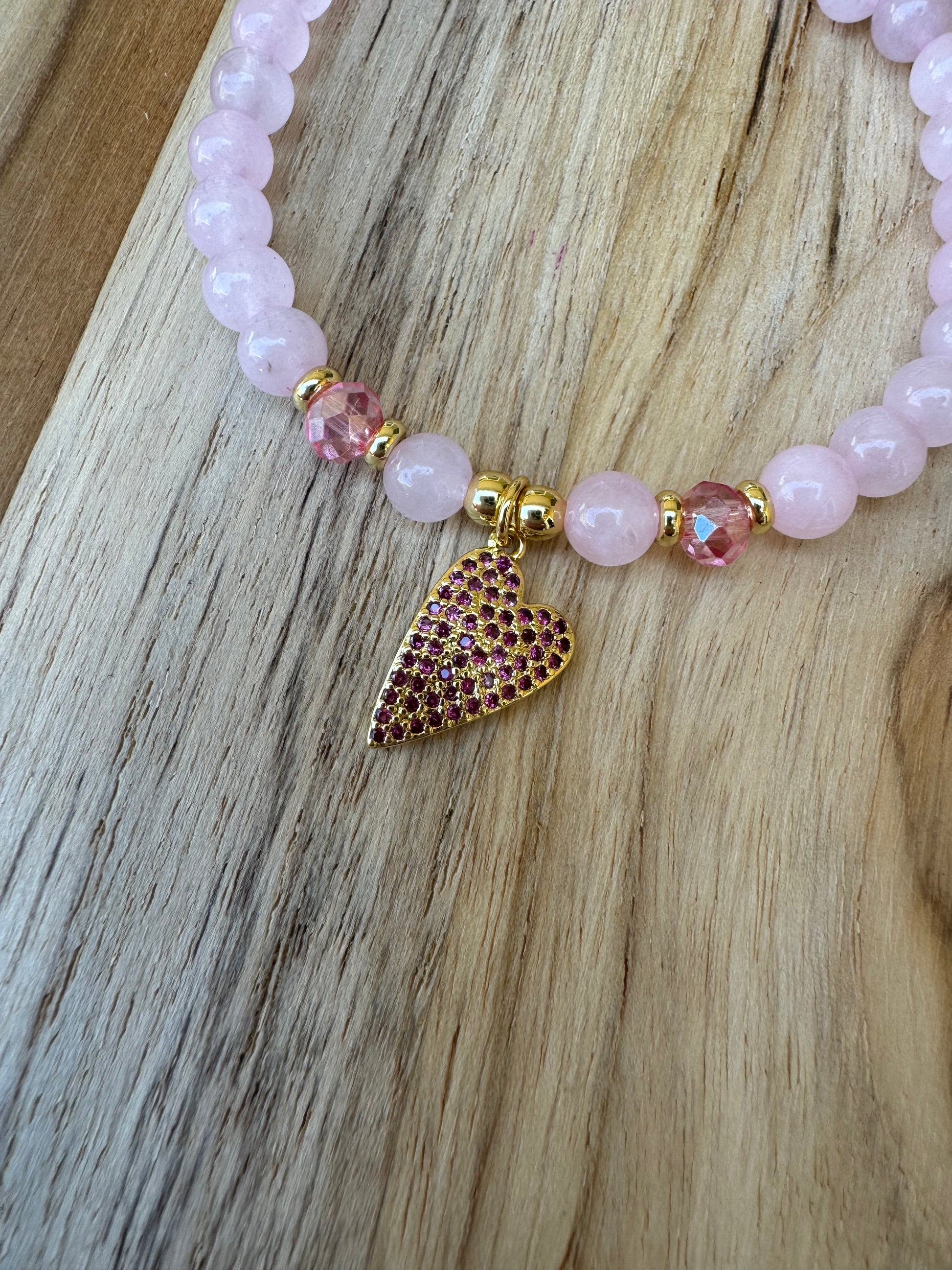 Rose Quartz Beaded Stretch Bracelet with Gold Heart Charm Pink Crystals