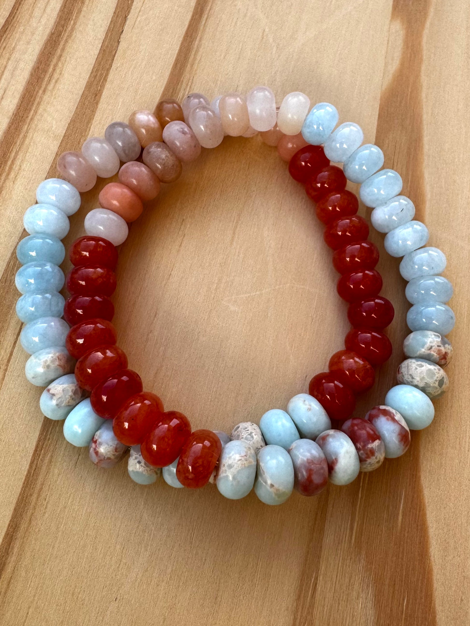 Surfer Style Beach Vibe Stretch Bracelet with Multi-Colored Gemstone Beads in Shades of Orange and Blue ~ 7"