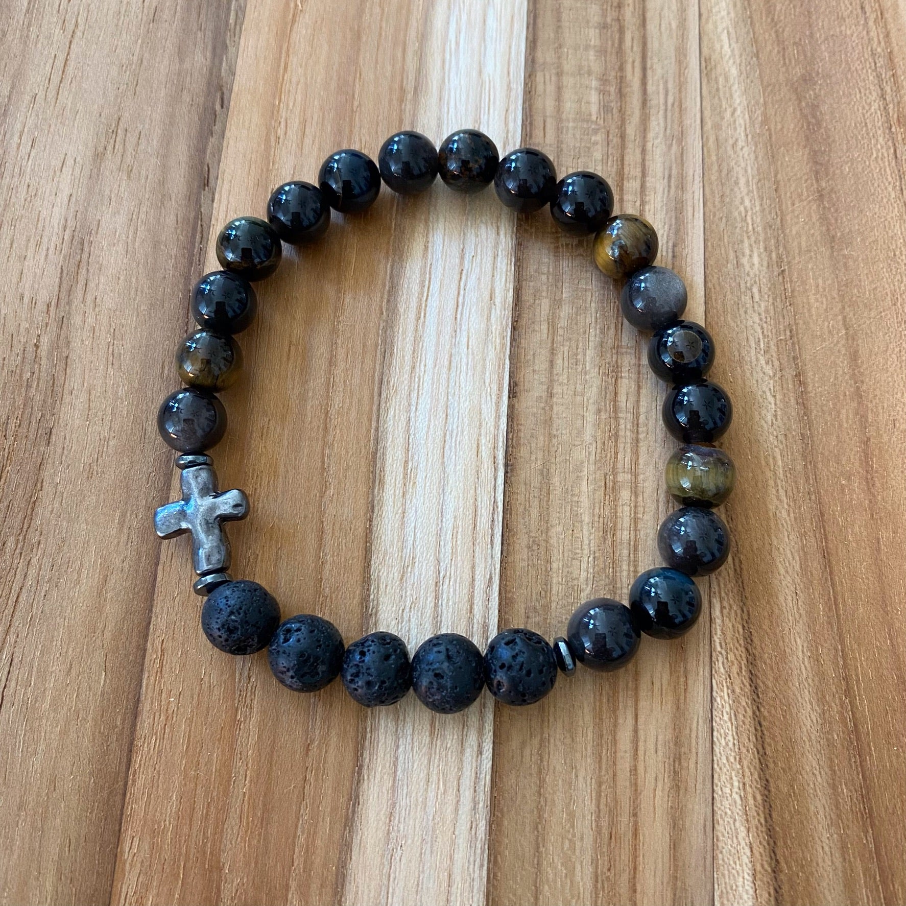 It is made with a mixture of 8mm dark blue and brown tiger eye, silver sheen obsidian black lava stone, hematite beads and a dark grey metal cross.