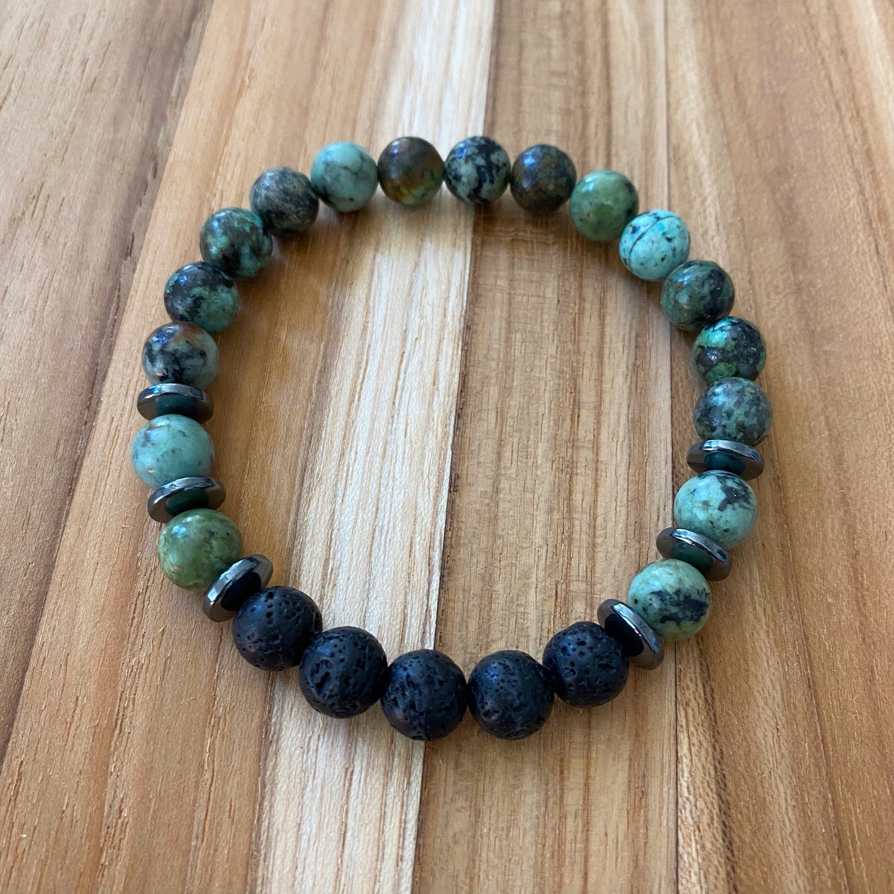 It is made with 8mm unpolished African turquoise, black lava stone, and hematite beads.