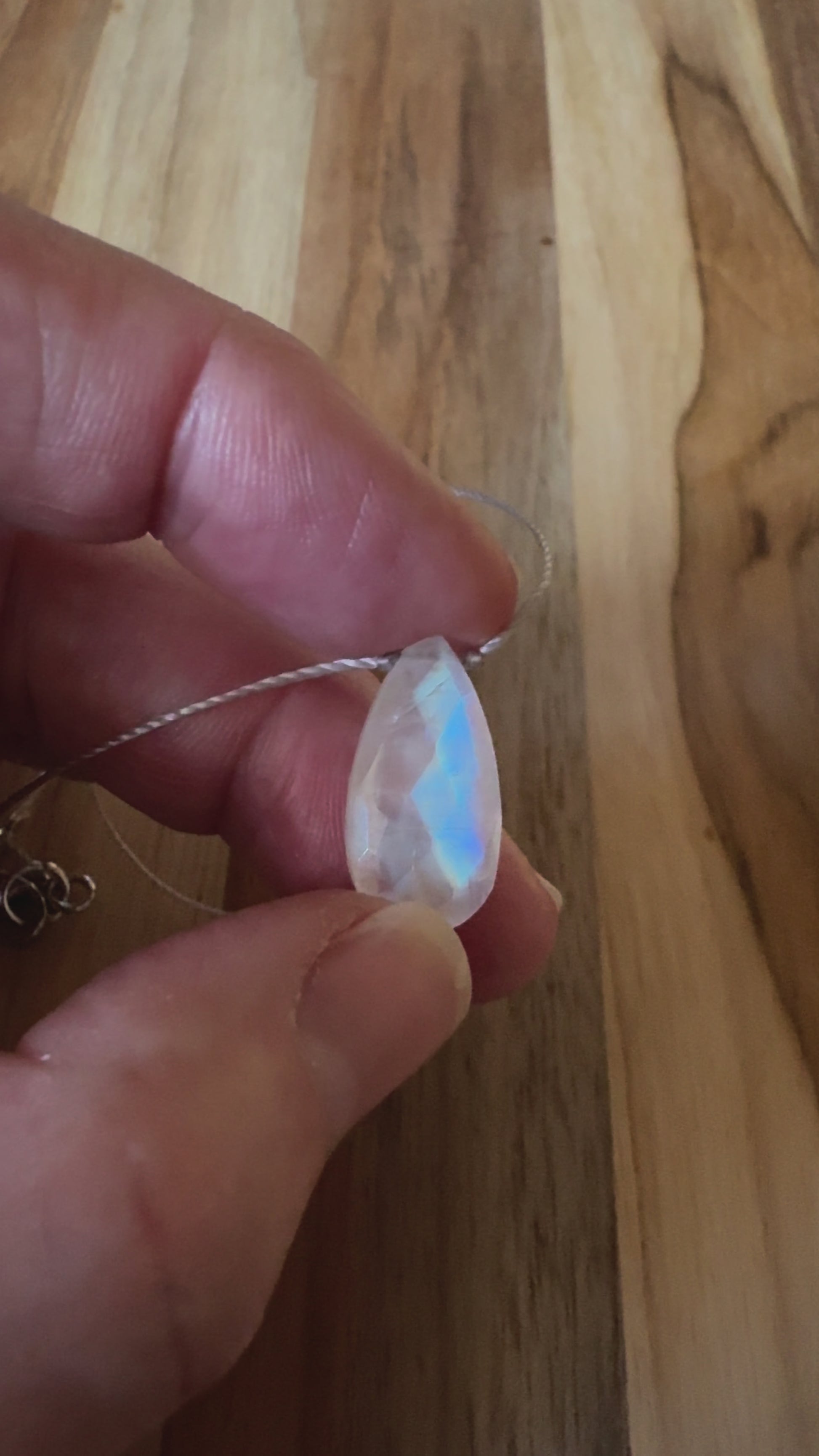Dainty rainbow moonstone minimal style floating pendant necklace with stainless steel clasp.