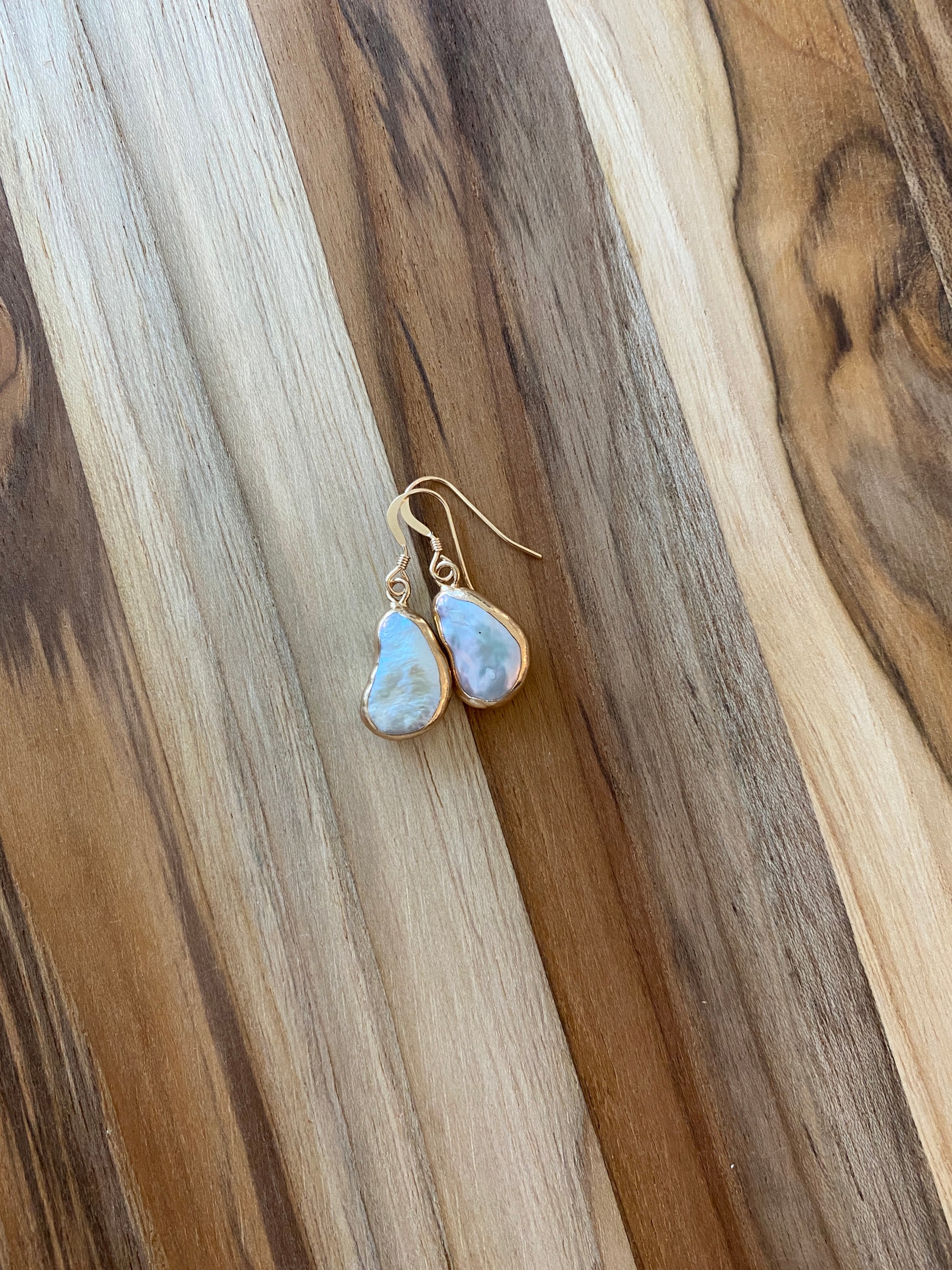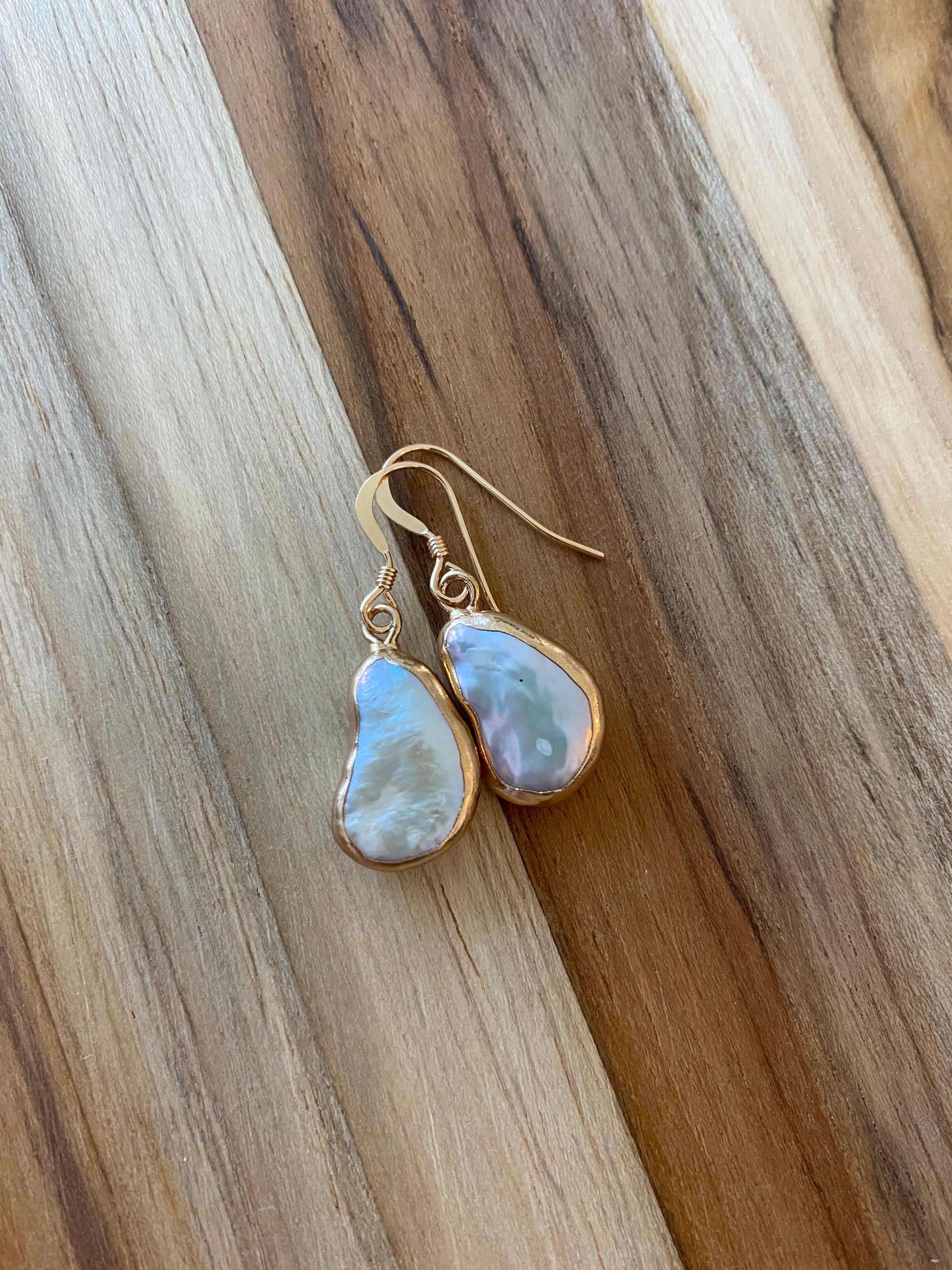 These earrings are AA+ quality, high luster white baroque pearls which are gold electroplated. They have a natural irregular shape, and may have bumps of natural pearls.