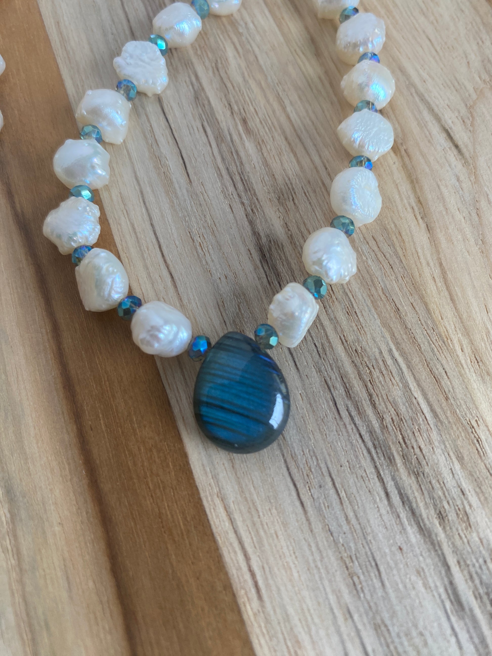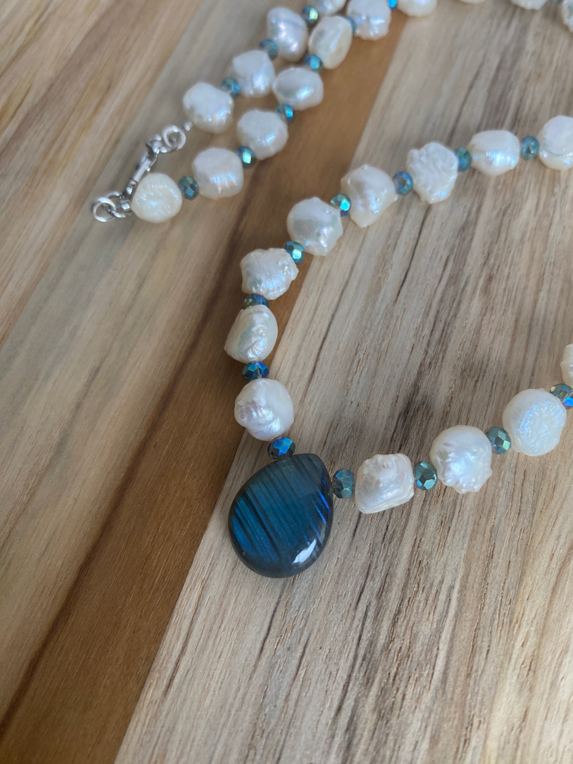 It is made with white 6-7mm white freshwater pearls. These are natural pearls and have a bumpy exterior, which makes them so unique. The pendant bead is a gorgeous piece of labradorite that has a stunning blue flash.