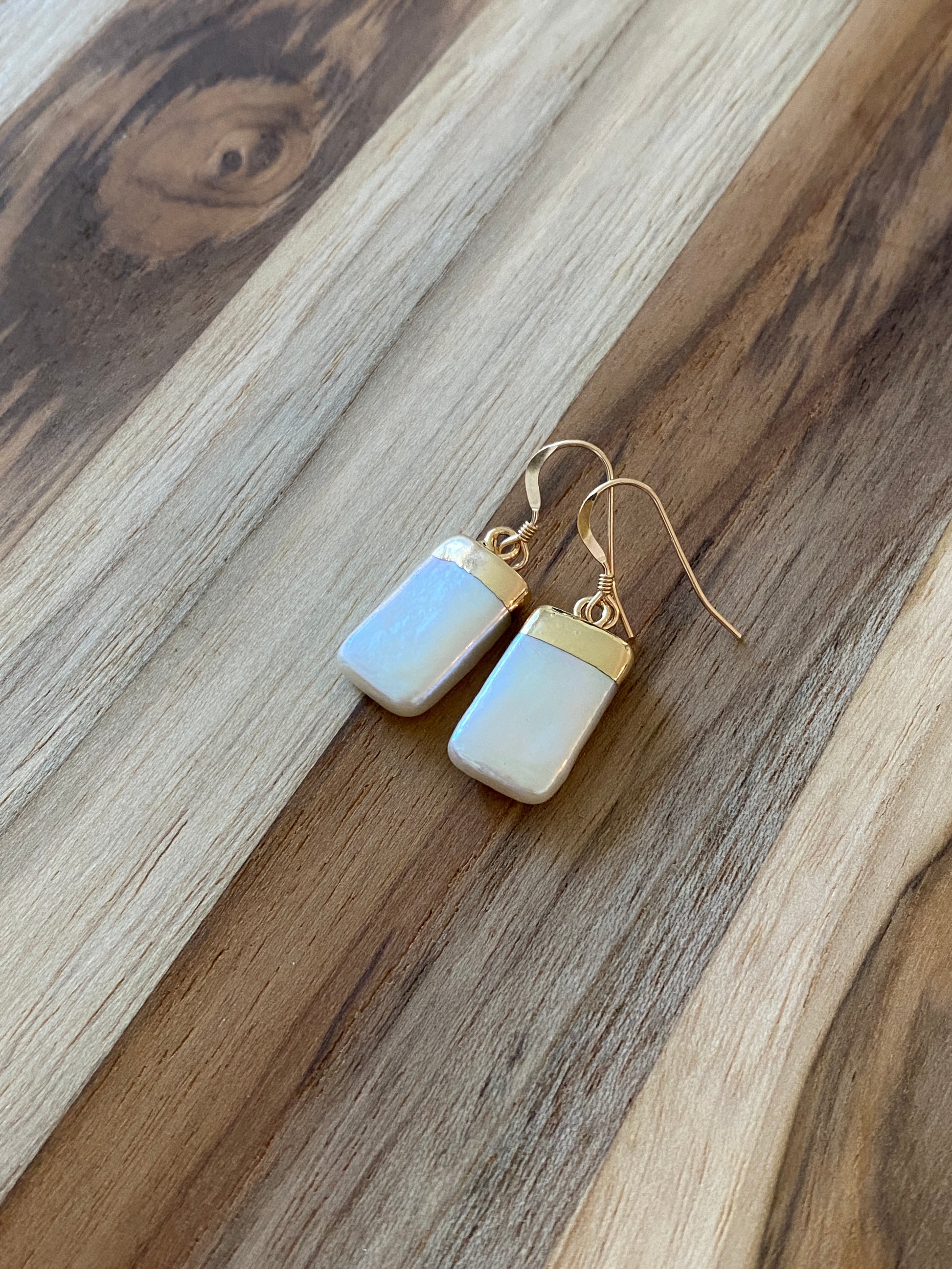 White Rectangle Genuine Freshwater Pearl Dangle Earrings with Gold