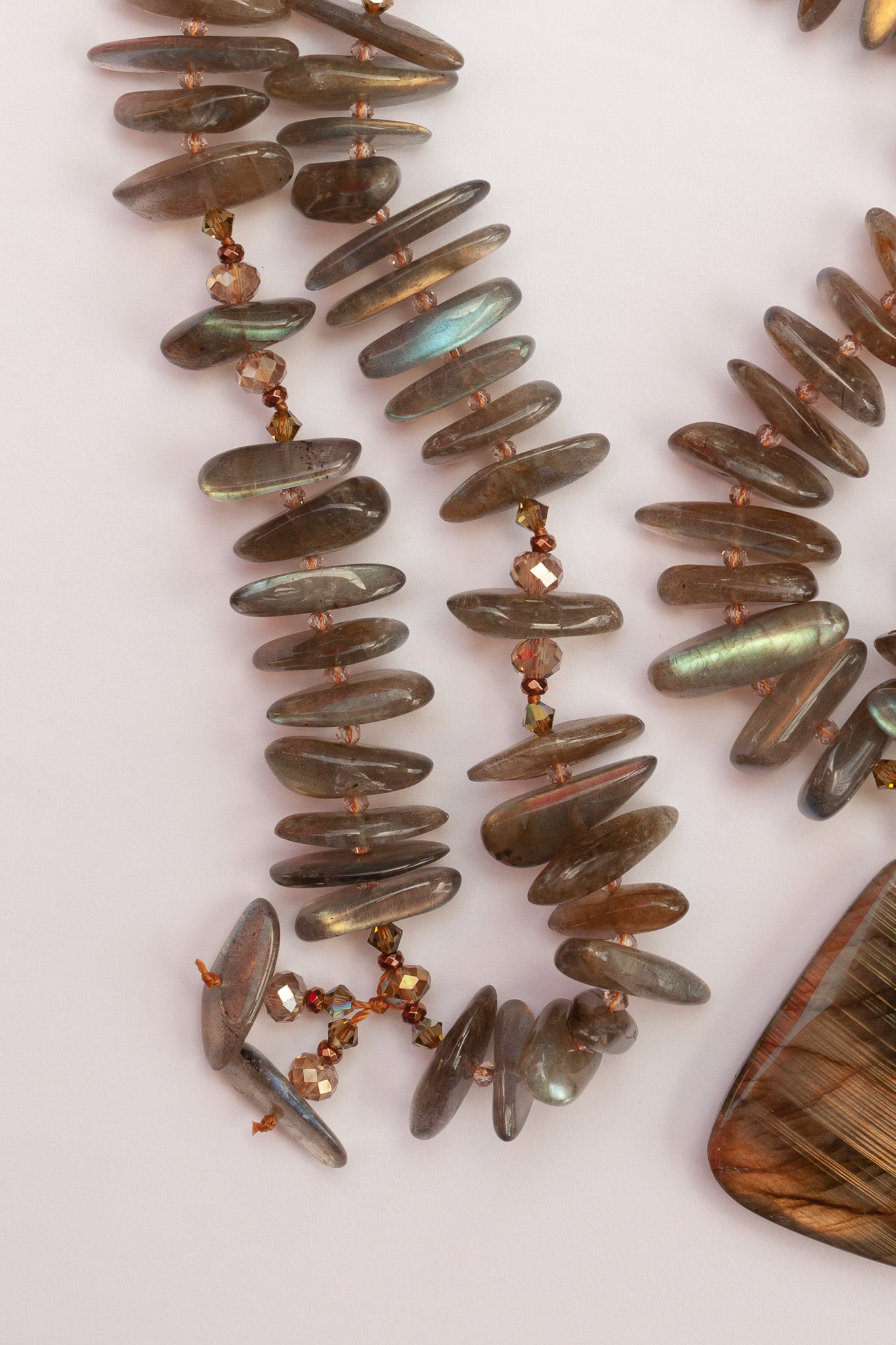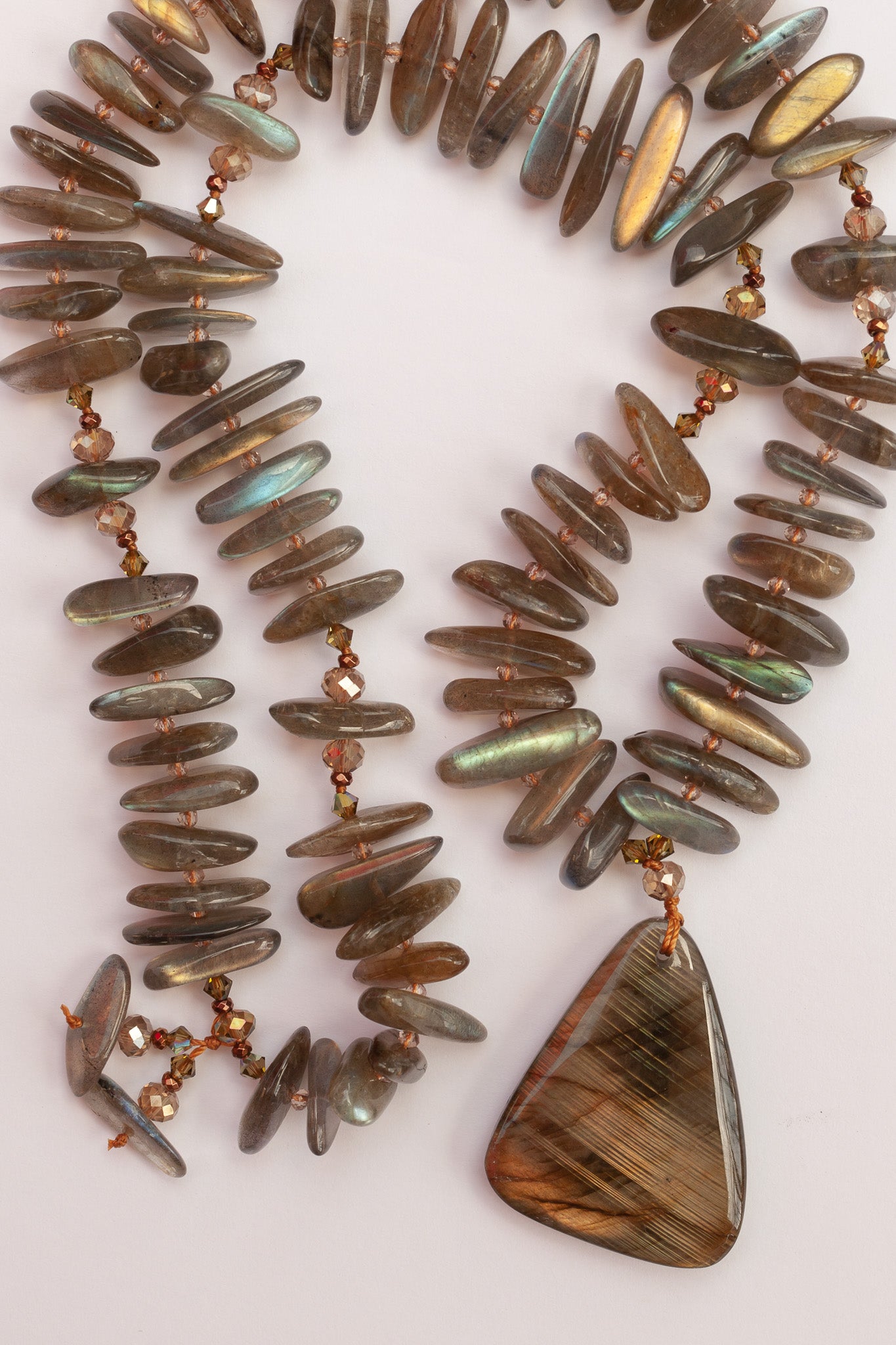28" Long Labradorite Beaded Pendant Necklace with Labradorite Tumbled Chip Beads and Crystal Accents