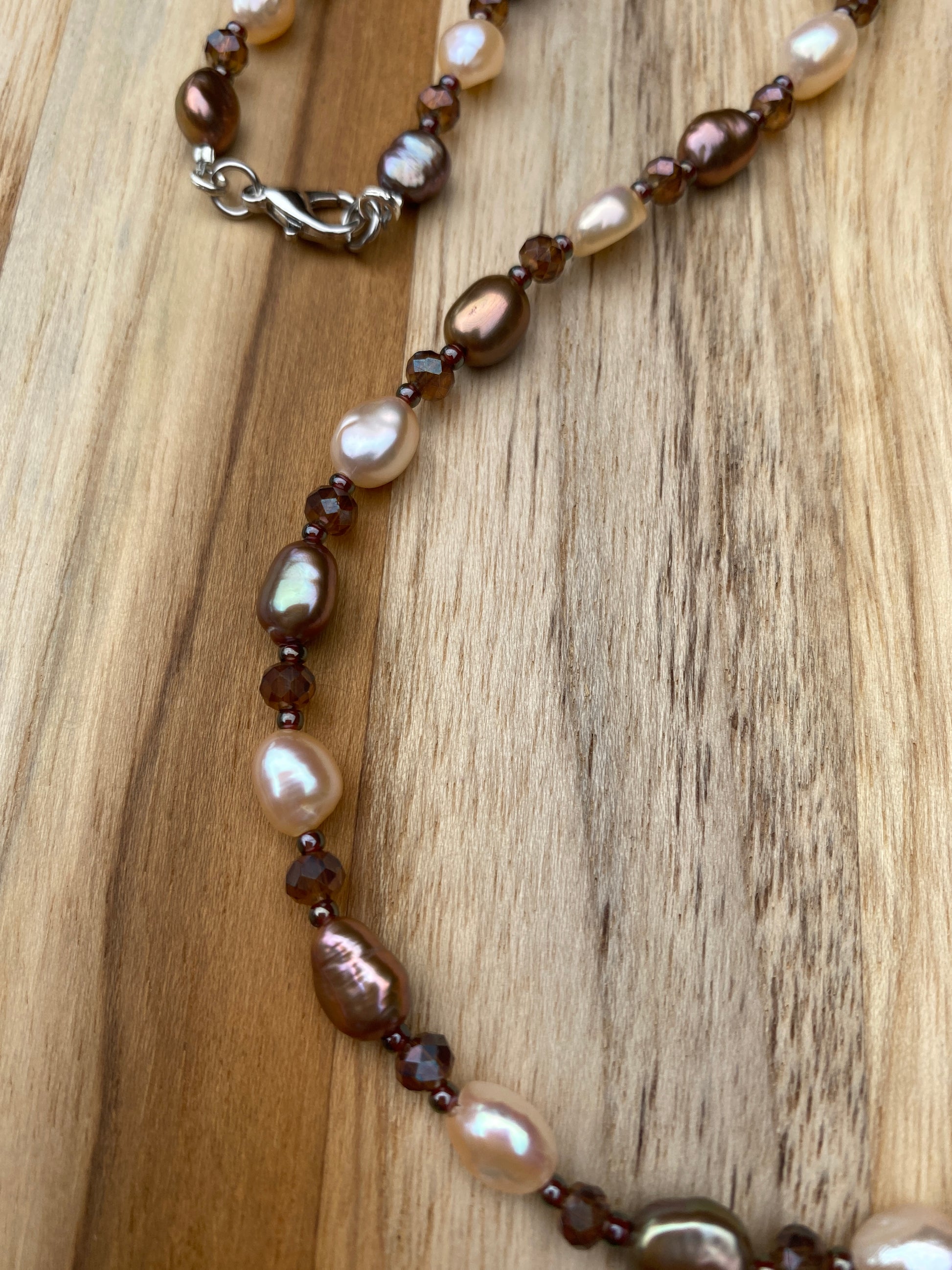 It is made with dainty freshwater pearls which range from 6-8mm in size, and are brown and peach/cream in color. It has been accented with tiny 4mm crystal glass beads in a pretty brown color. Each bead is separated with a brown colored seed bead. Necklace is finished with a silver tone metal clasp.