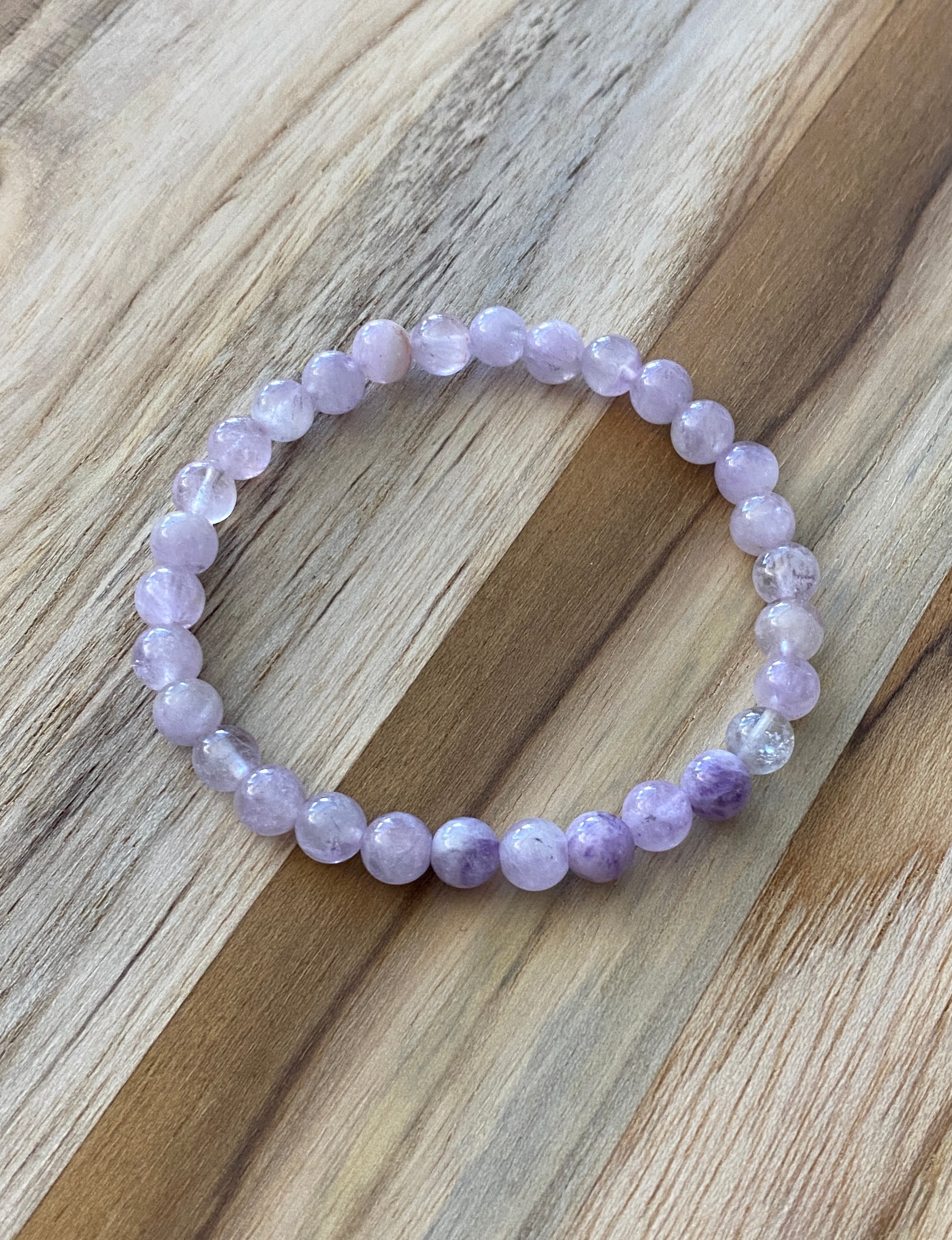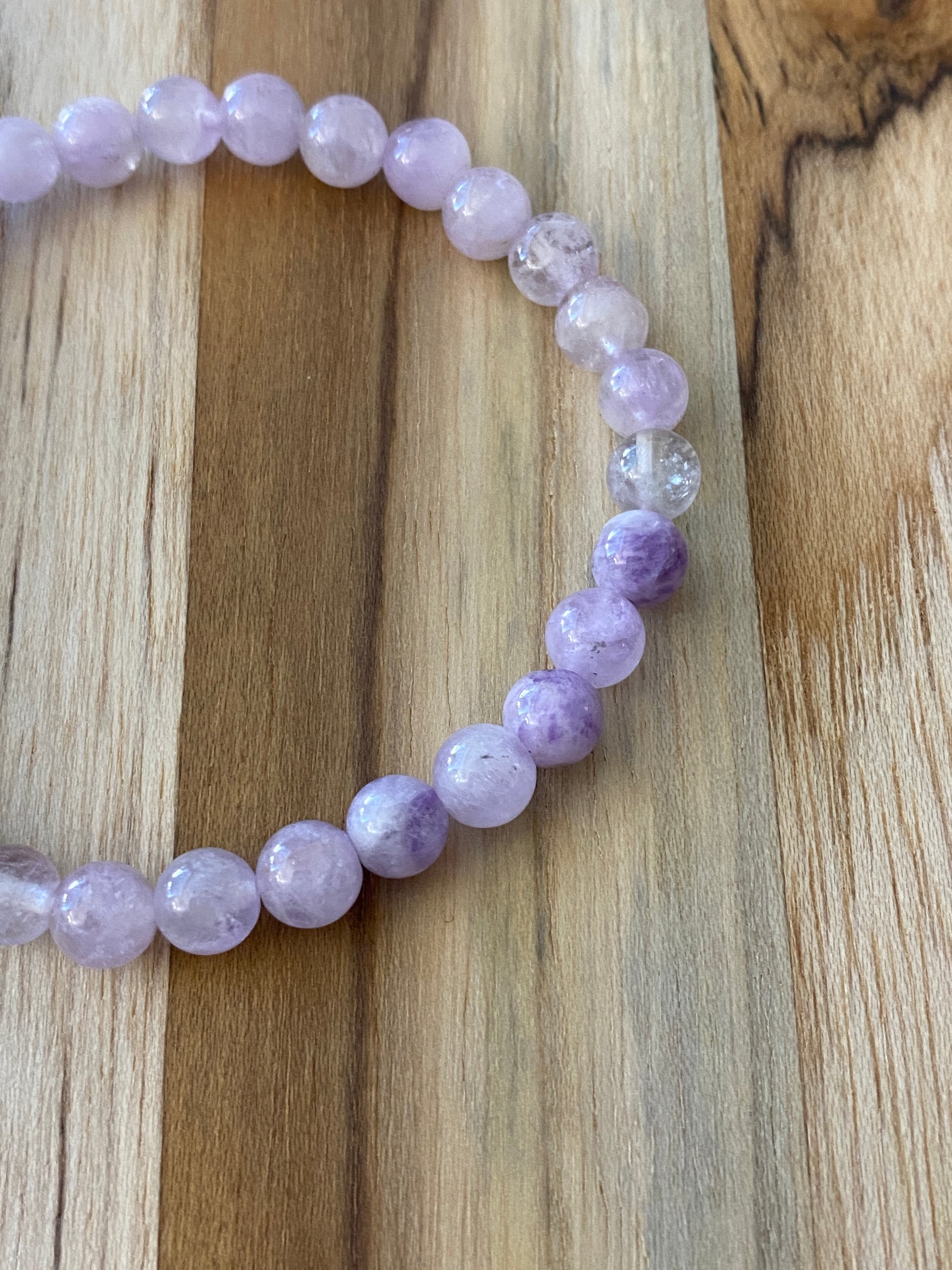 This pale lavender amethyst stretch bracelet features 6mm beads that showcase the gentle beauty of this gemstone. Amethyst is known for its soothing energy, promoting tranquility and calmness. The stretchy design allows for comfortable wear and easy on/off, making it a perfect everyday accessory.