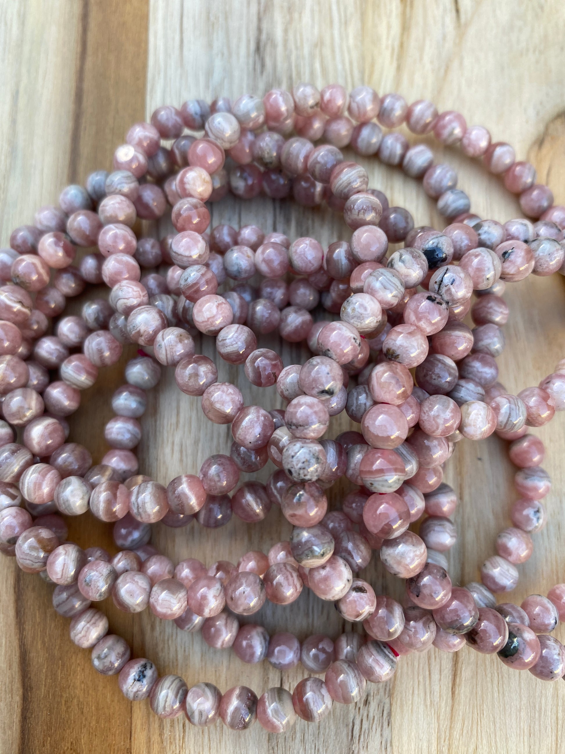 Rhodochrosite is a beautiful gemstone that is known for its stunning pink color that is often described as a rose or a raspberry hue. My 5mm rhodochrosite beaded stretch bracelet showcases the natural beauty of this gemstone.