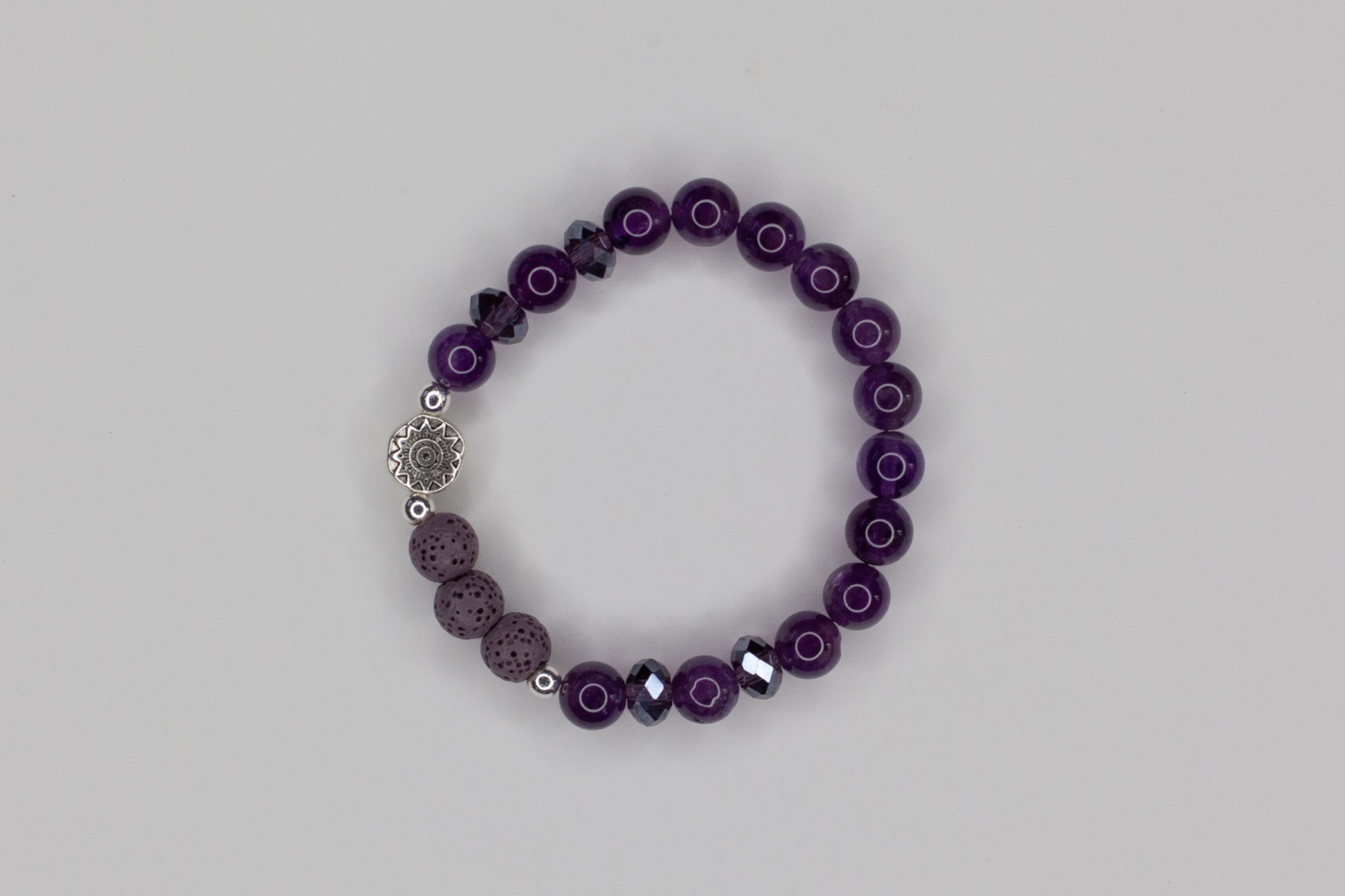 Take your essential oils on the go with a trendy amethyst and purple lava stone diffuser stretchy bracelet.