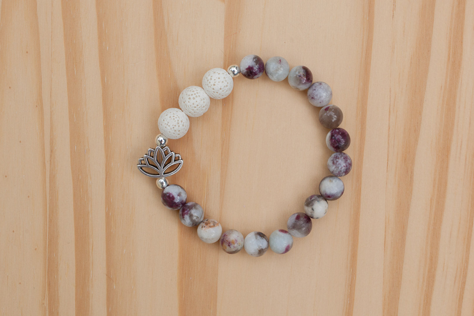 Wear your favorite aromatherapy fragrance wherever you go with this trendy flower tourmaline and white lava stone stretchy bracelet.