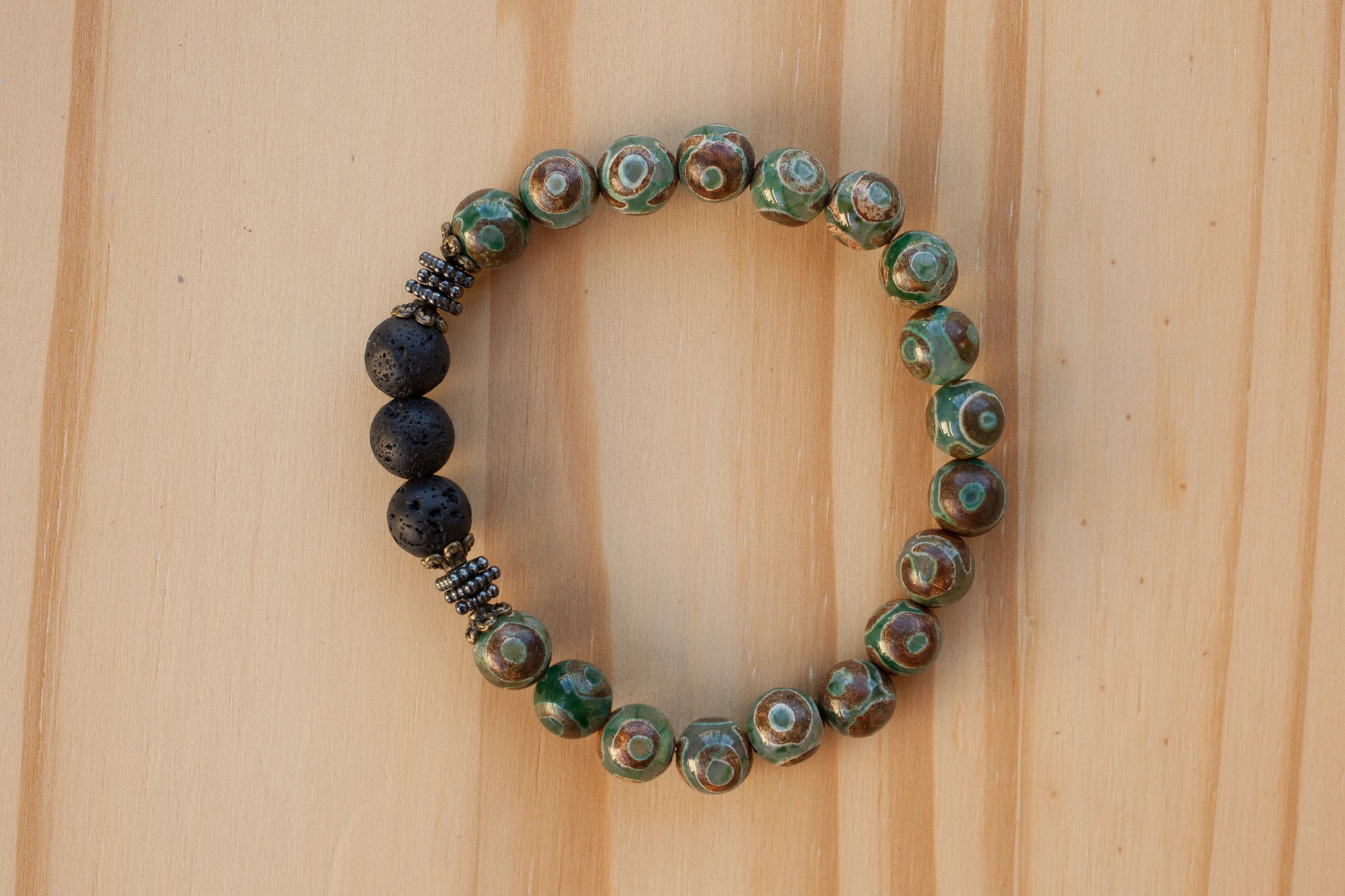 Bracelet consists of 8mm green evil eye agate, 8mm black lava stone, and metal accents.