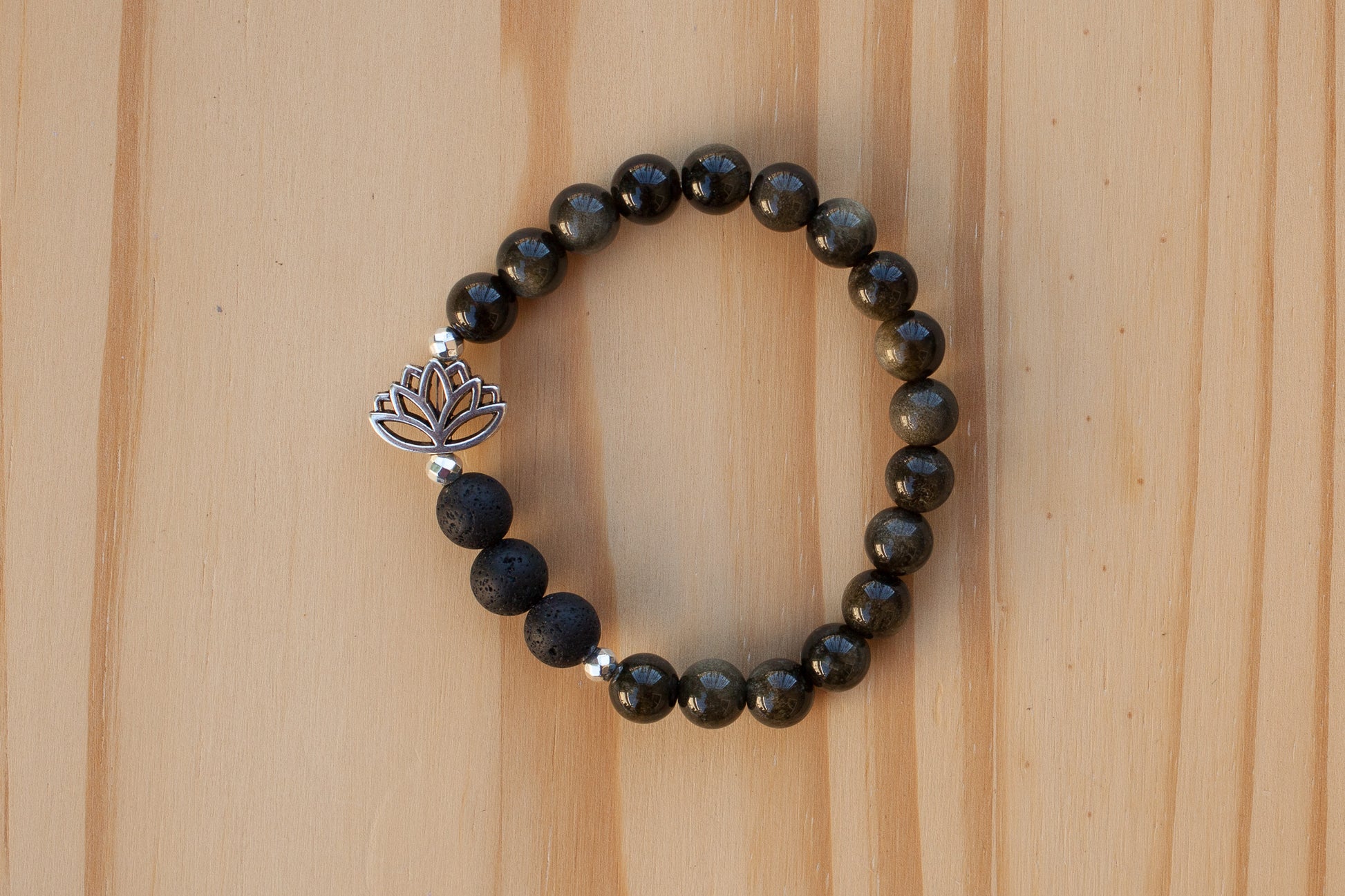 Bracelet consists of 8mm obsidian, 8mm black lava rock, 4mm silver plated hematite beads, and a silver tone lotus flower.