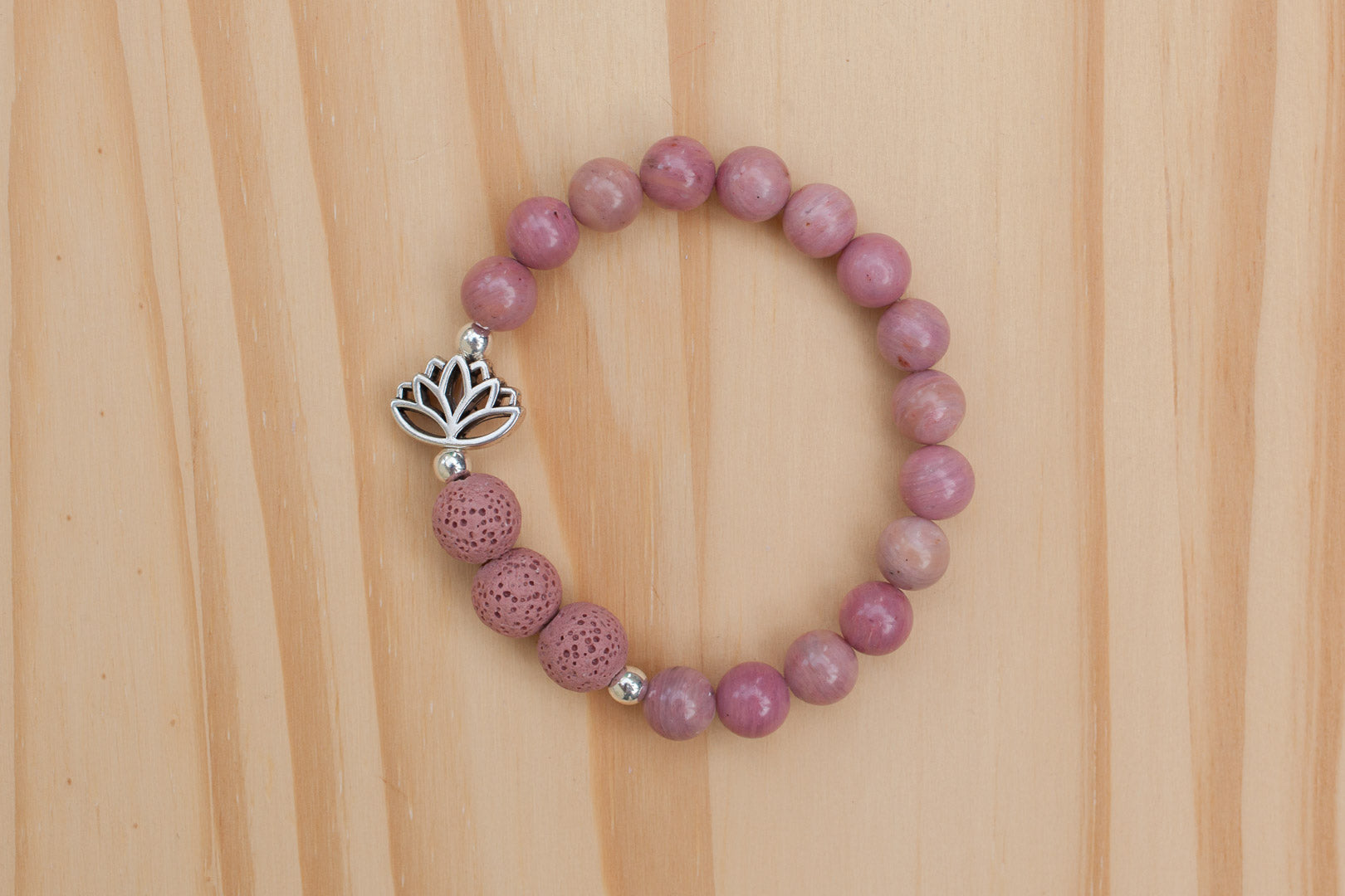 Wear your favorite aromatherapy fragrance wherever you go with this trendy rhodonite and pink lava stone stretchy bracelet.
