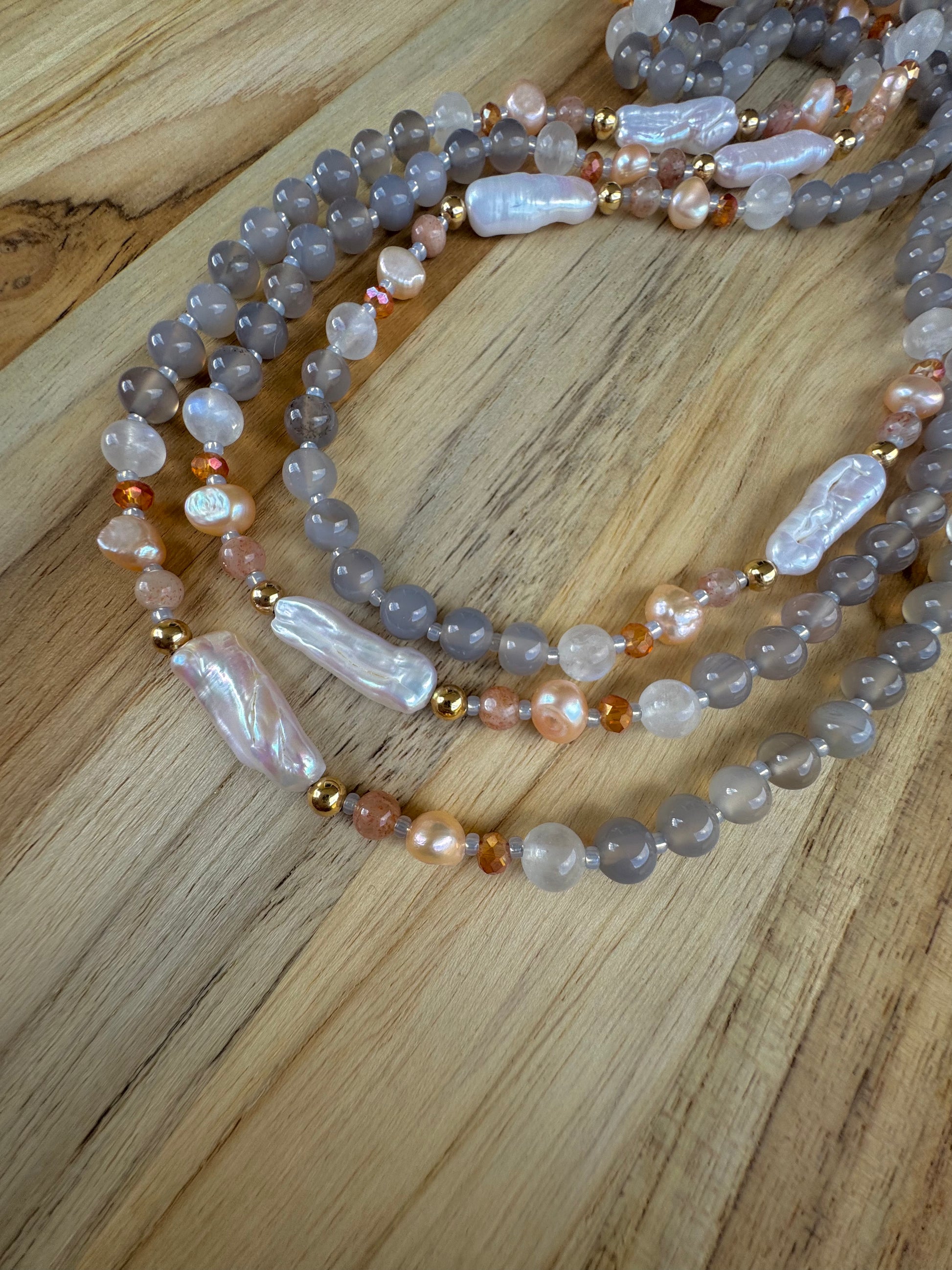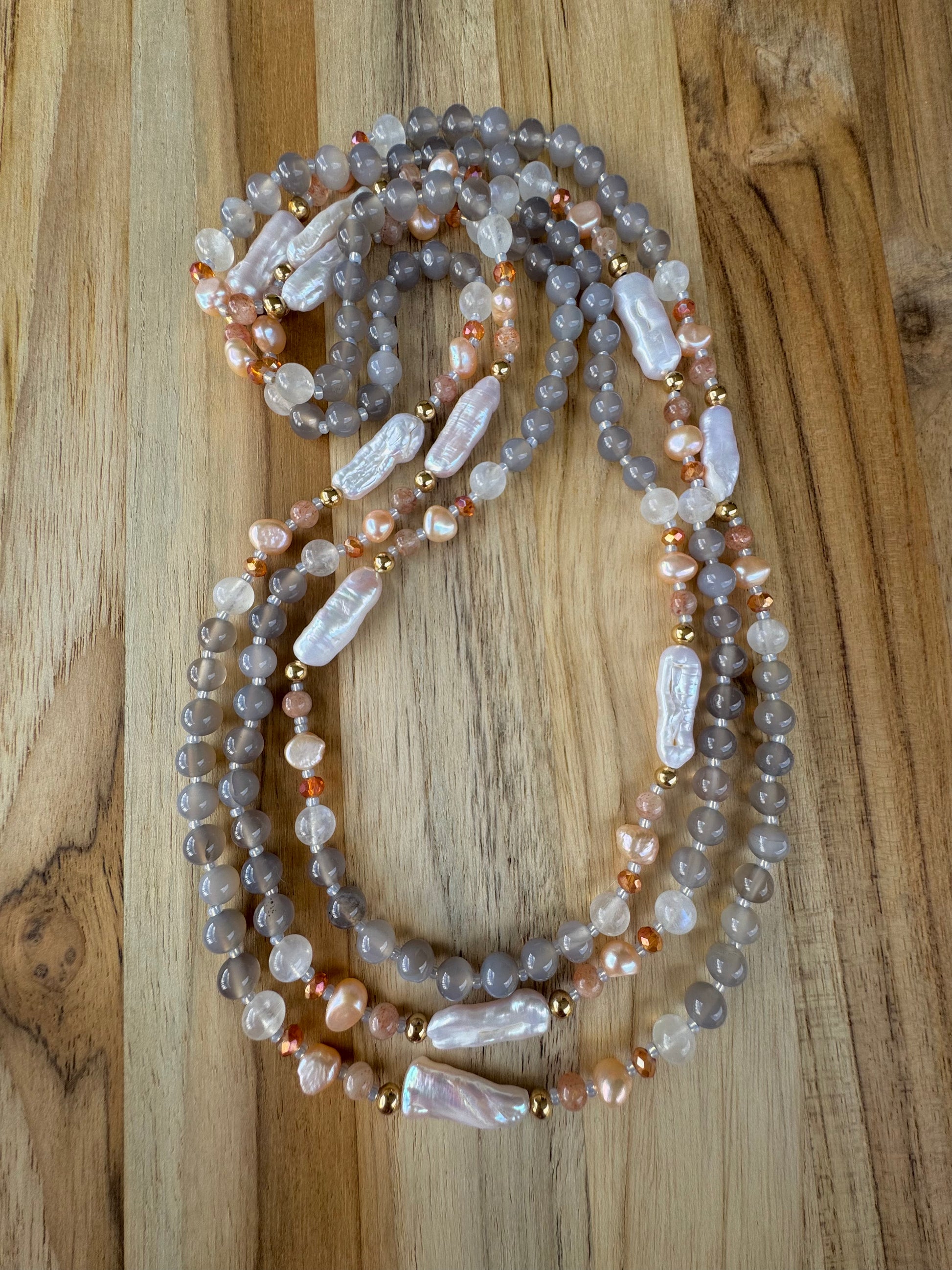 60” Extra Long Wraparound Style Biwa Stick Pearl Beaded Necklace with Grey Agate Moonstone Peach Pearl Peach Strawberry Quartz and Crystal Beads