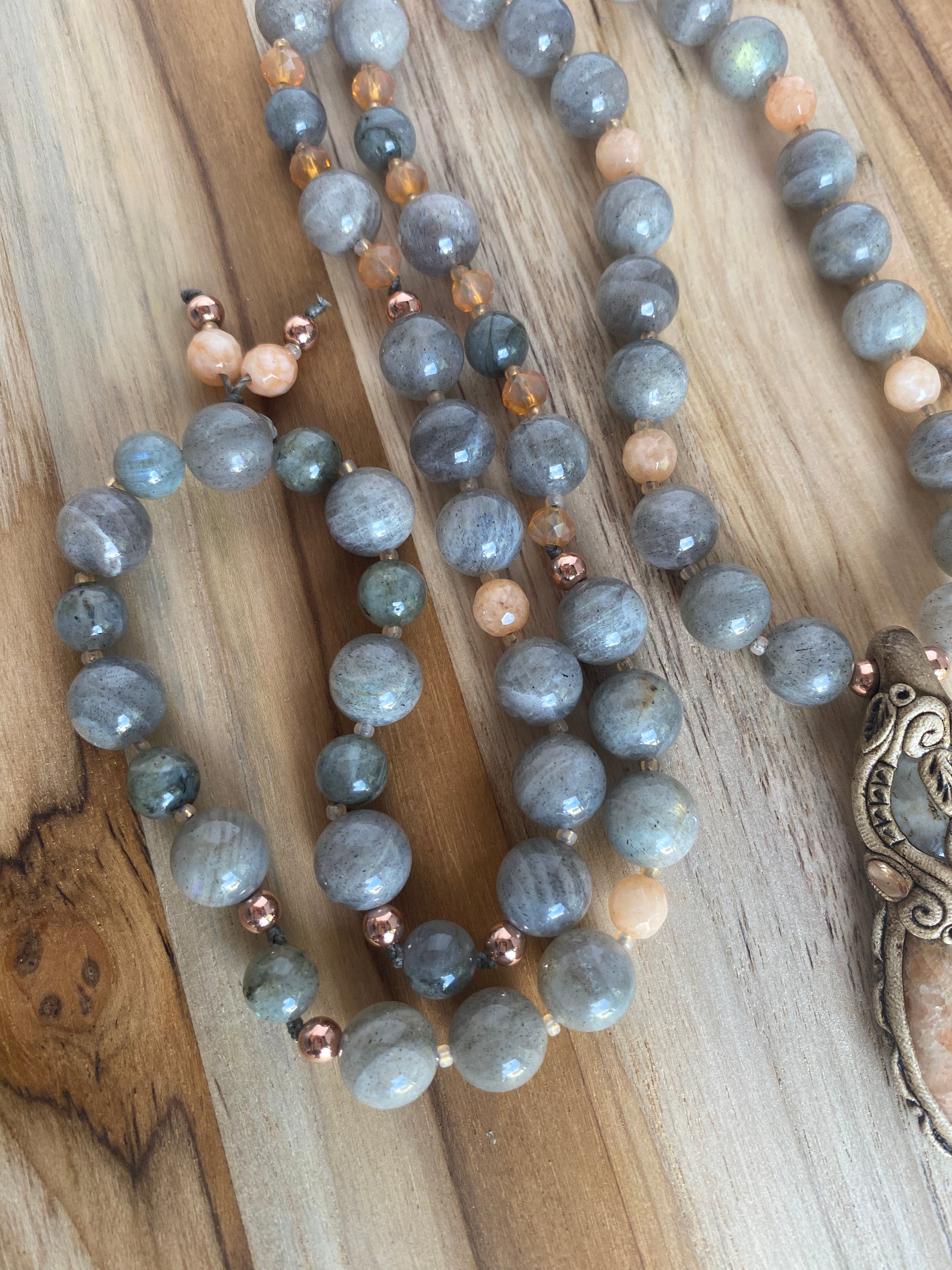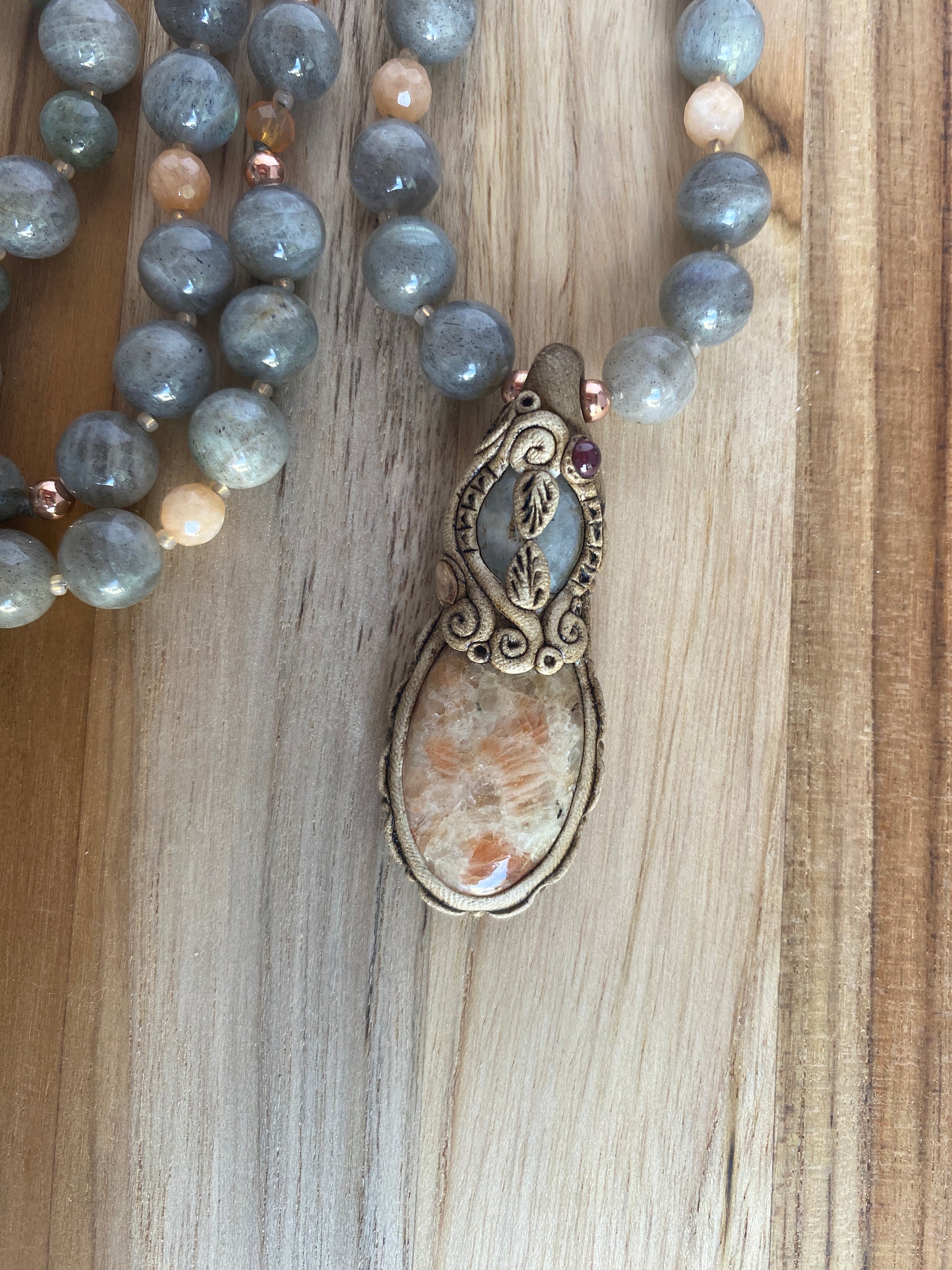 This very unique clay pendant was handmade in India. The main stones are sunstone and moonstone. It has a small garnet accent and another unknown tiny gem. I have hand knotted this piece with light grey colored 10mm & 8mm labradorite, and peach colored faceted agate. It is highlighted with a few orange/peach colored crystals, and some rose gold plated hematite beads.
