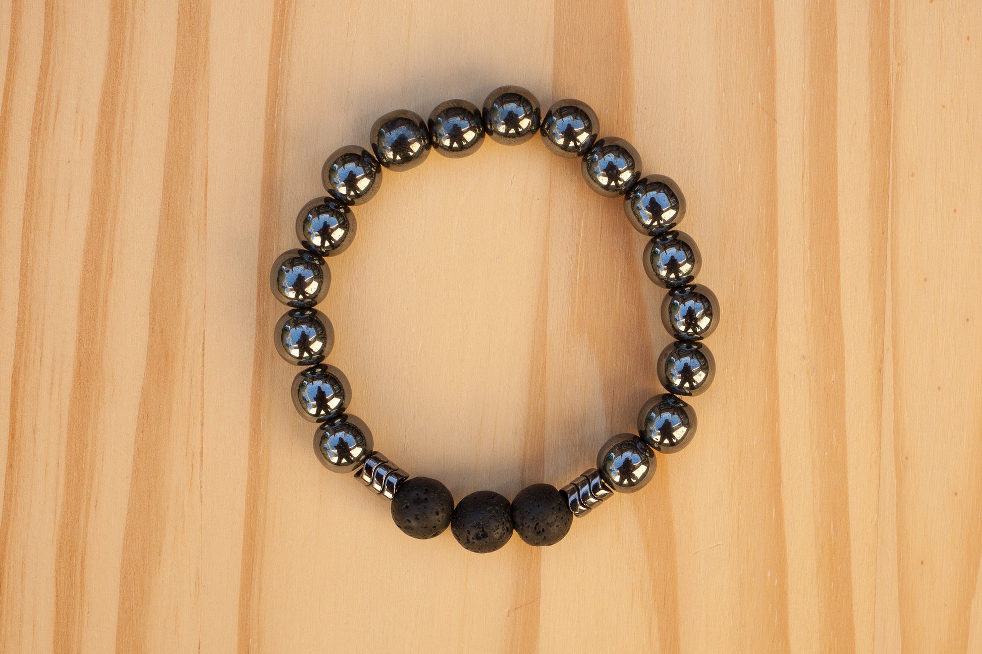 Wear your favorite aromatherapy essential oils wherever you go with this trendy and very fashionable beaded hematite and black lava stone stretchy diffuser bracelet.