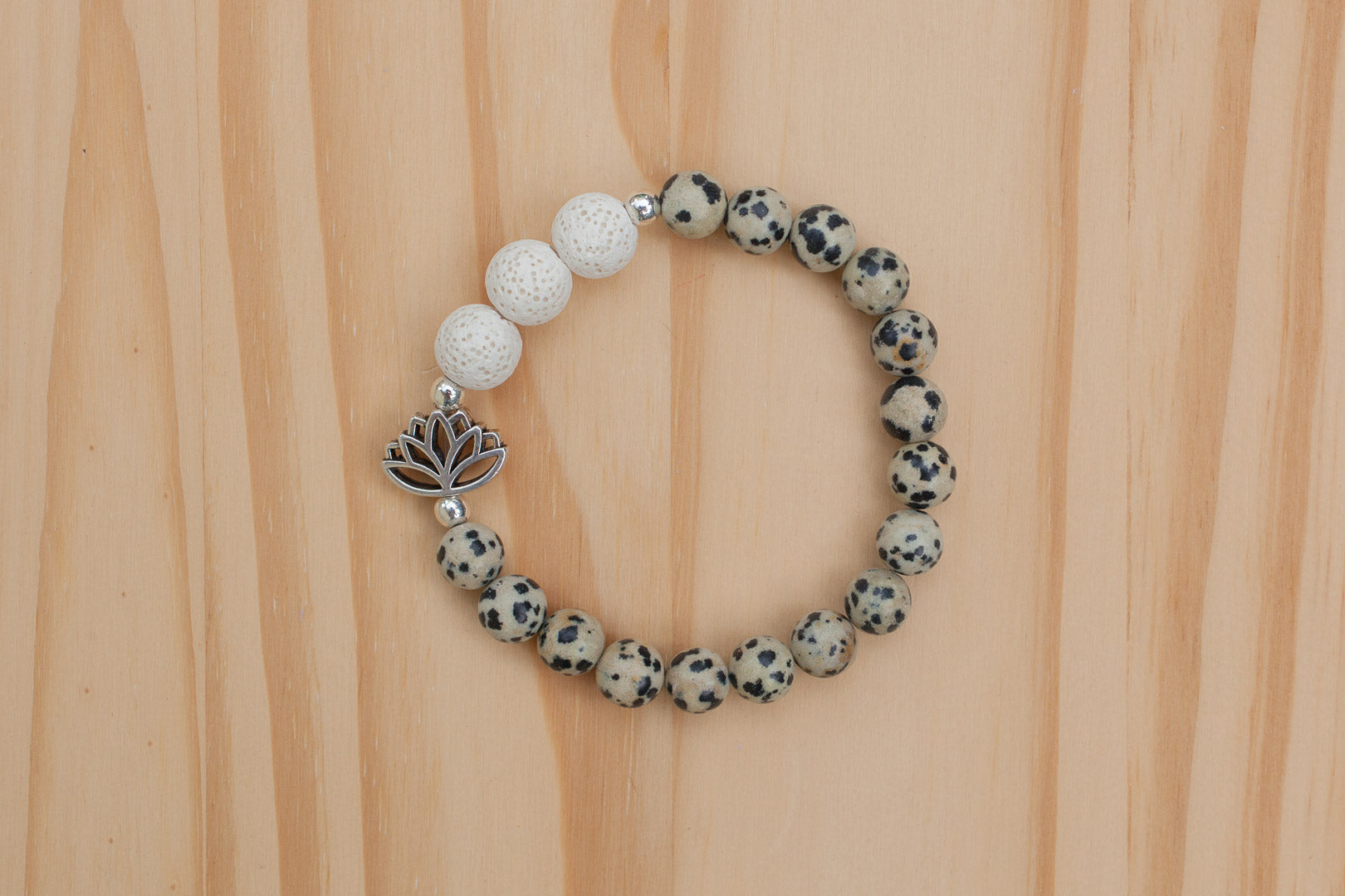 Essential Oil Diffuser Aromatherapy Dalmatian Jasper Stretchy Bracelet with Lotus Flower