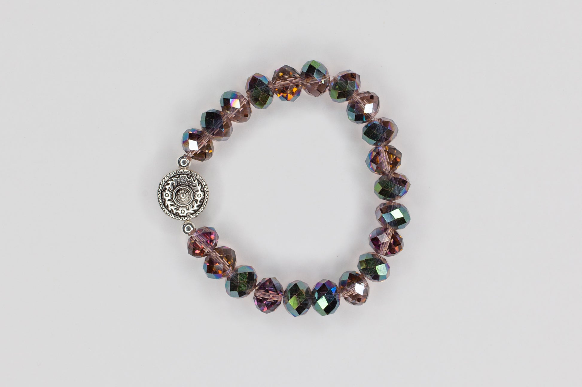 Made with 10mm crystal glass, 5mm silver plated hematite, and a silver tone metal medallion bead.