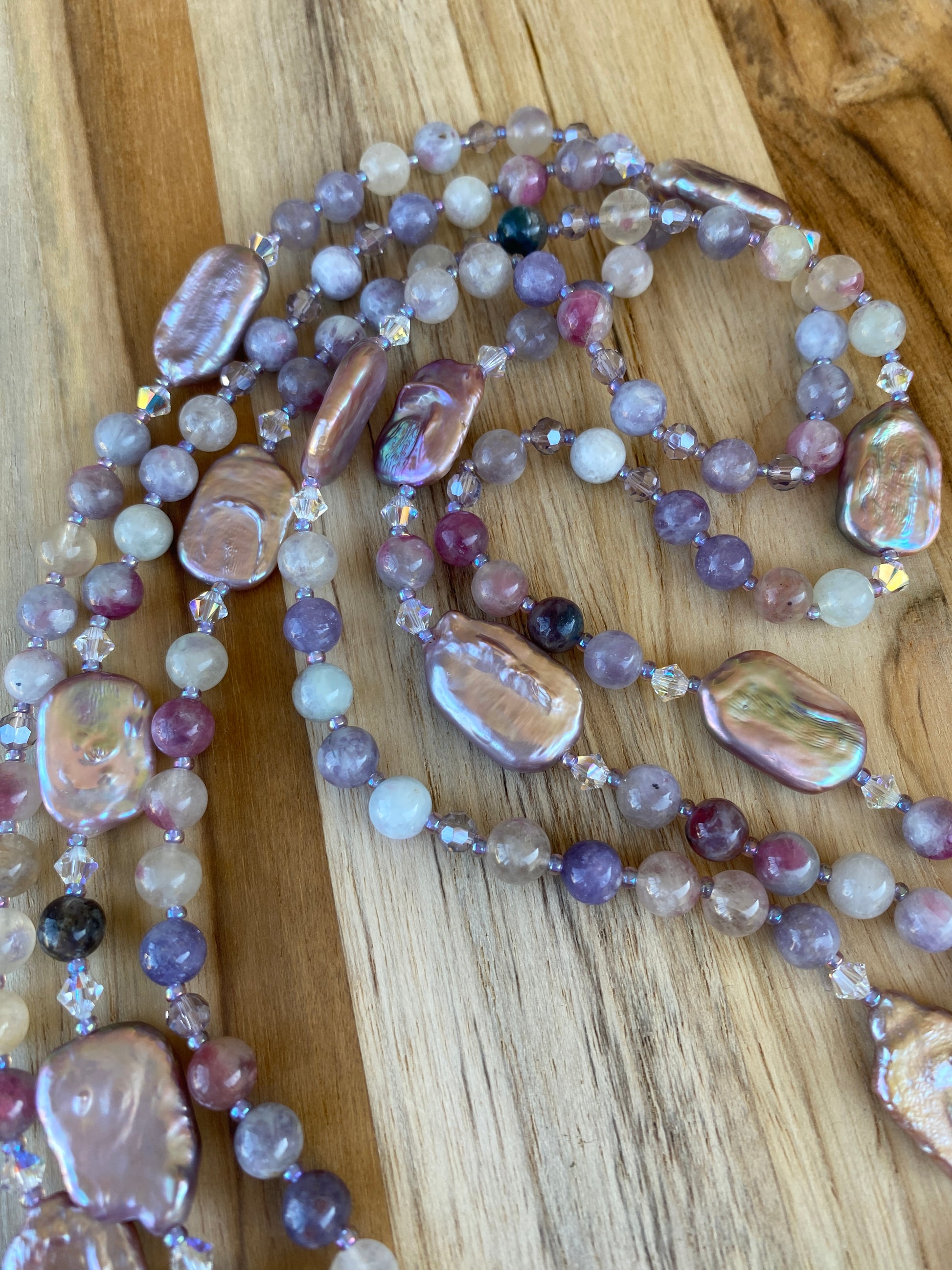 60" Extra Long Wraparound Style Lavender Purple Beaded Biwa Pearl and Unicorn Stone Wraparound Style Necklace with Crystal Beads