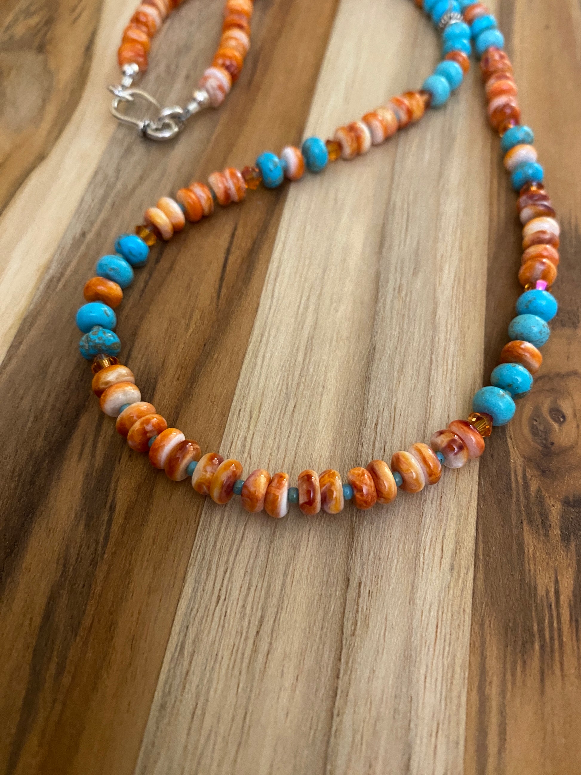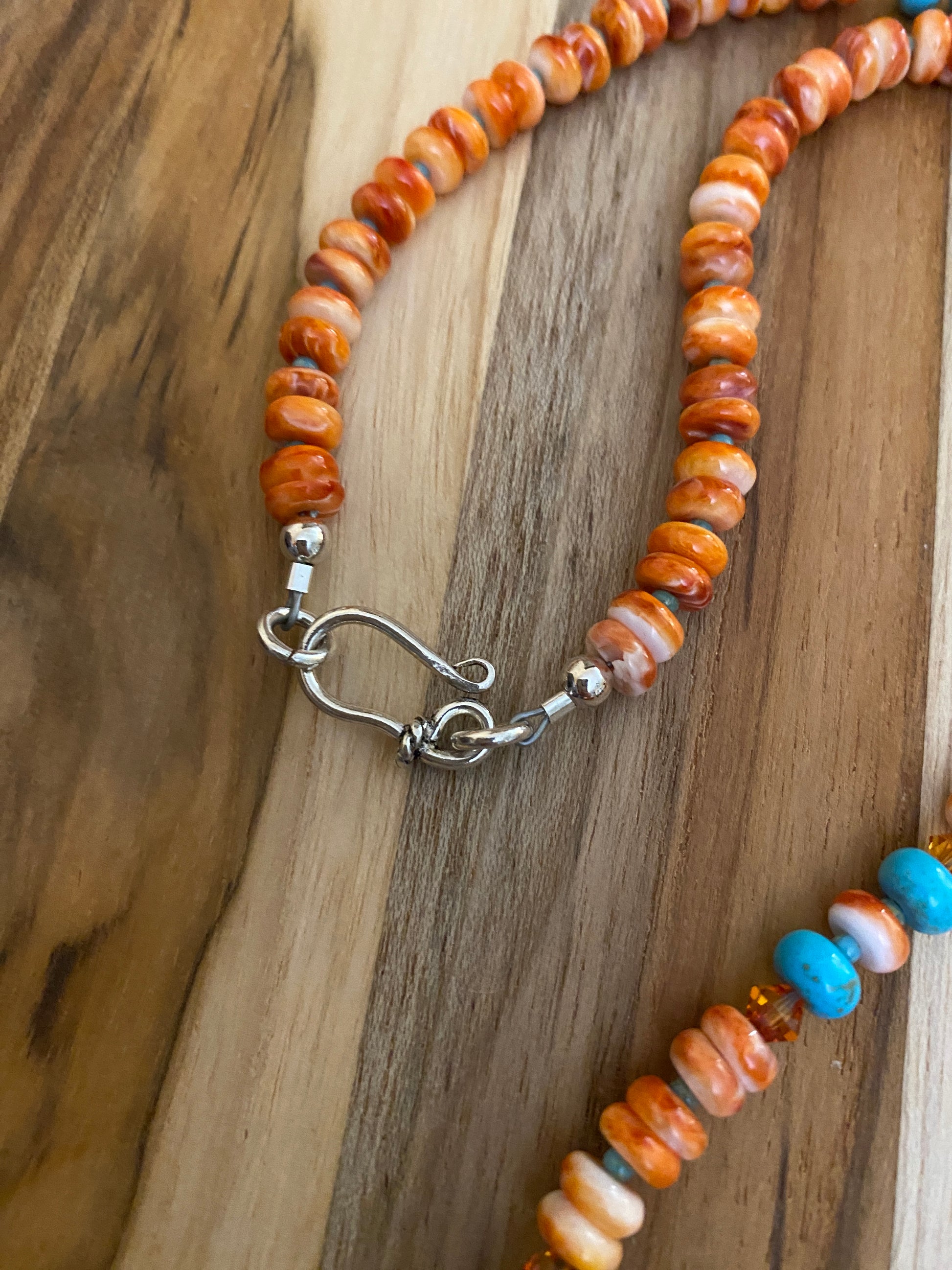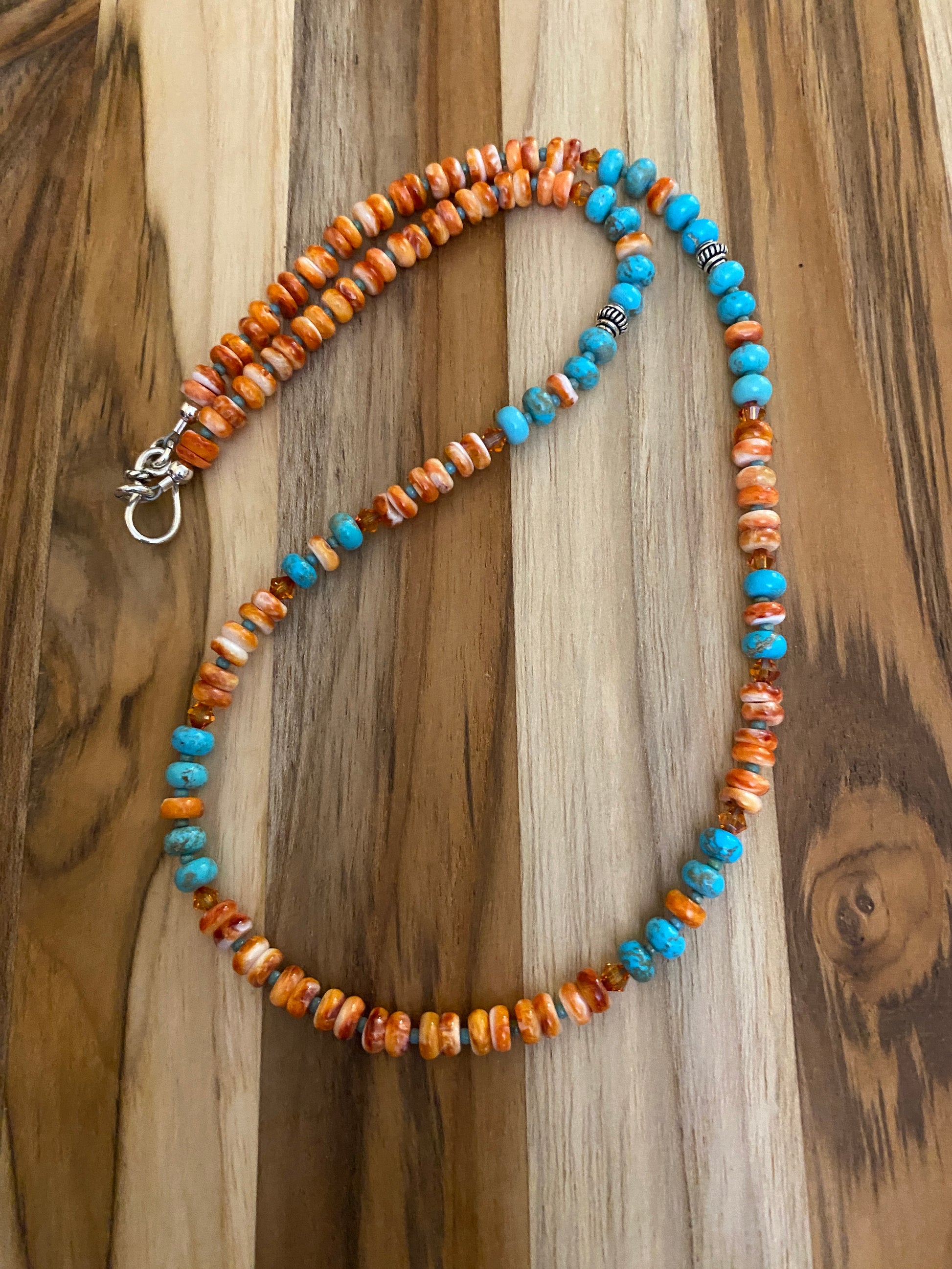 It has been strung with gorgeous 6mm Nevada natural blue turquoise and orange spiny oyster beads, and accented with 4mm Swarovski crystals and Bali silver beads. There is a tiny turquoise colored seed bead separating some of the beads. This allows beautiful drape and flexibility. The necklace is approx. 20” in length and has been finished off with a sterling silver hook style clasp.