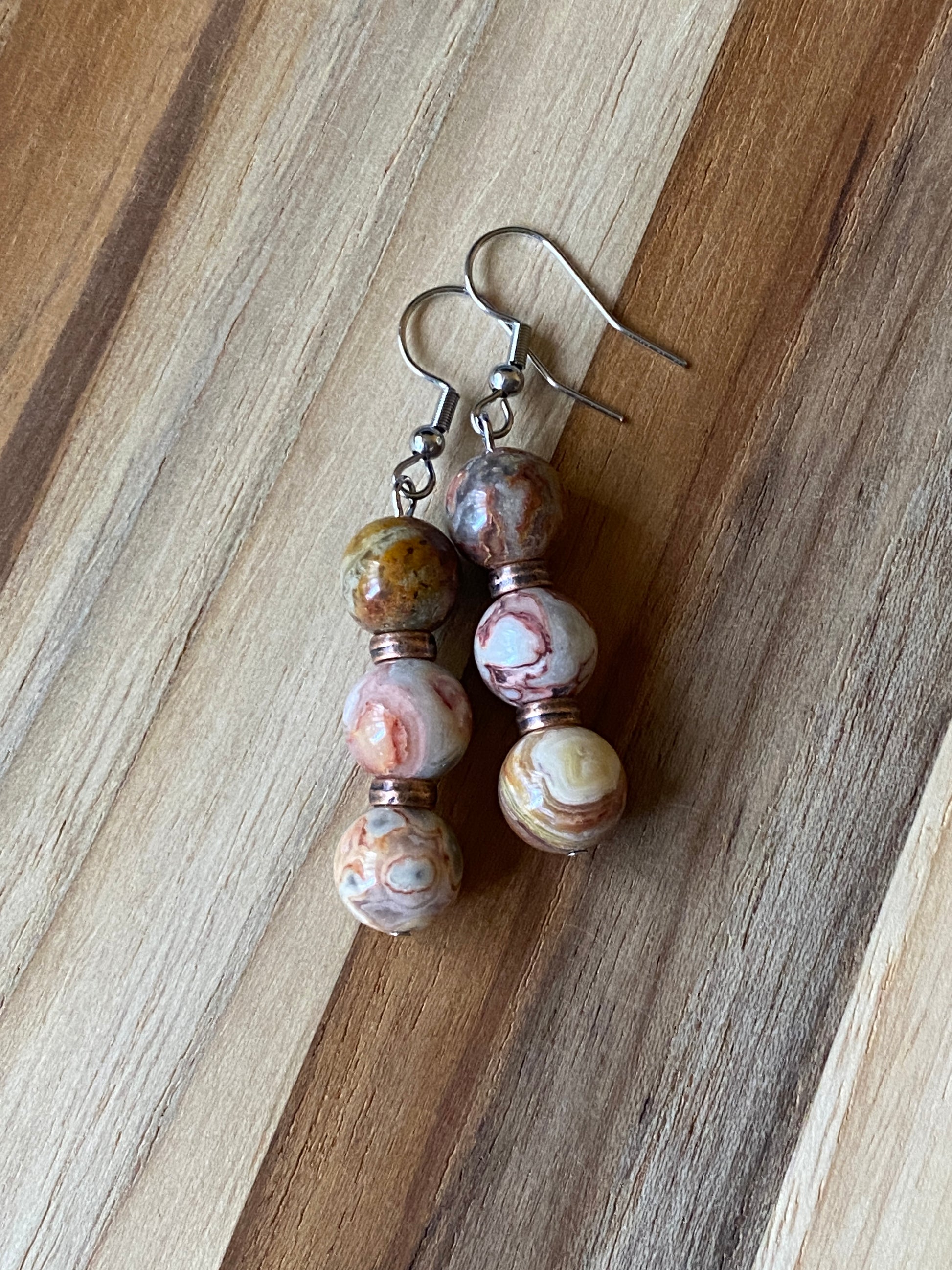 Red Crazy Lace Agate Dangle Earrings with Copper Accents