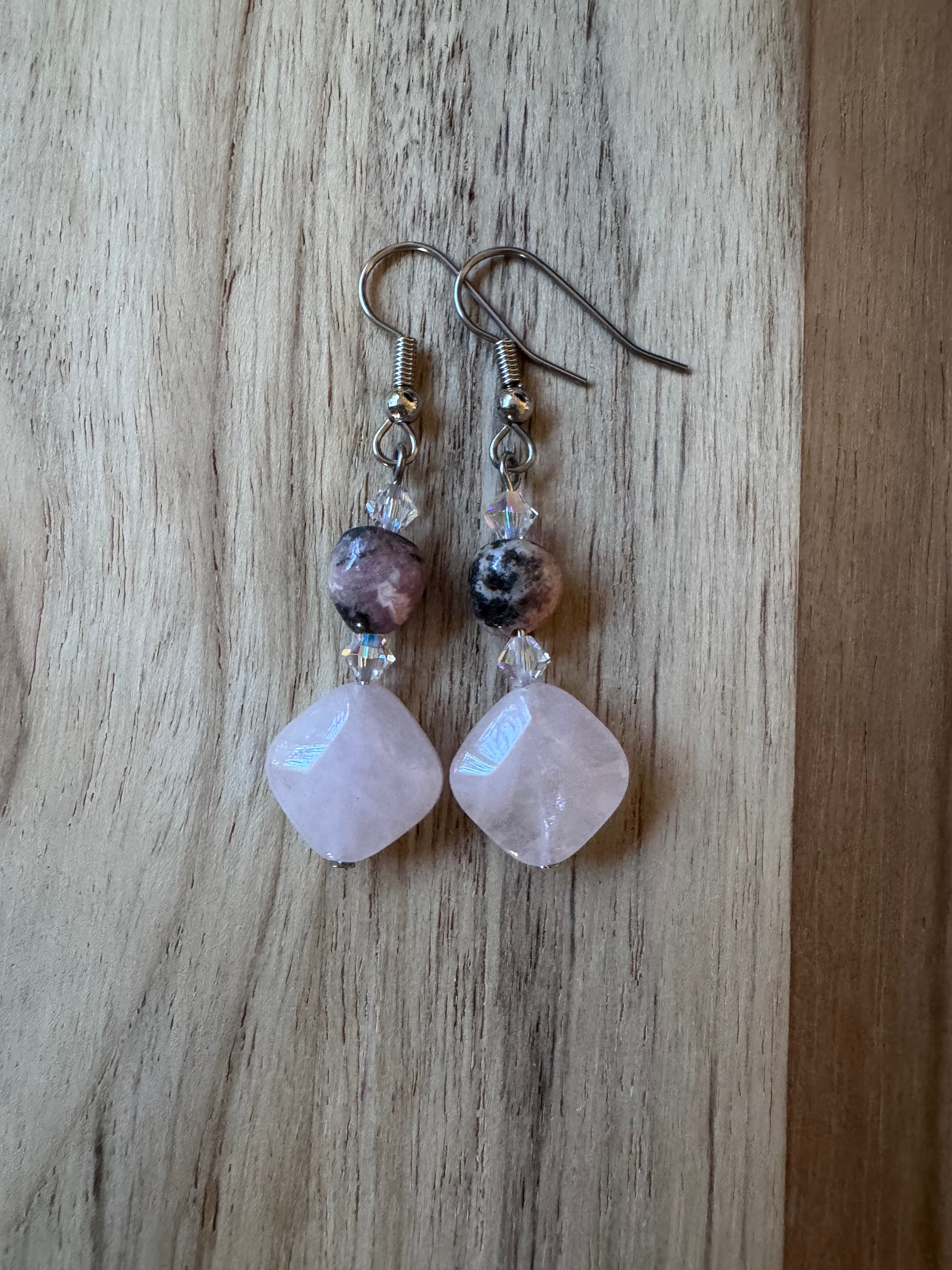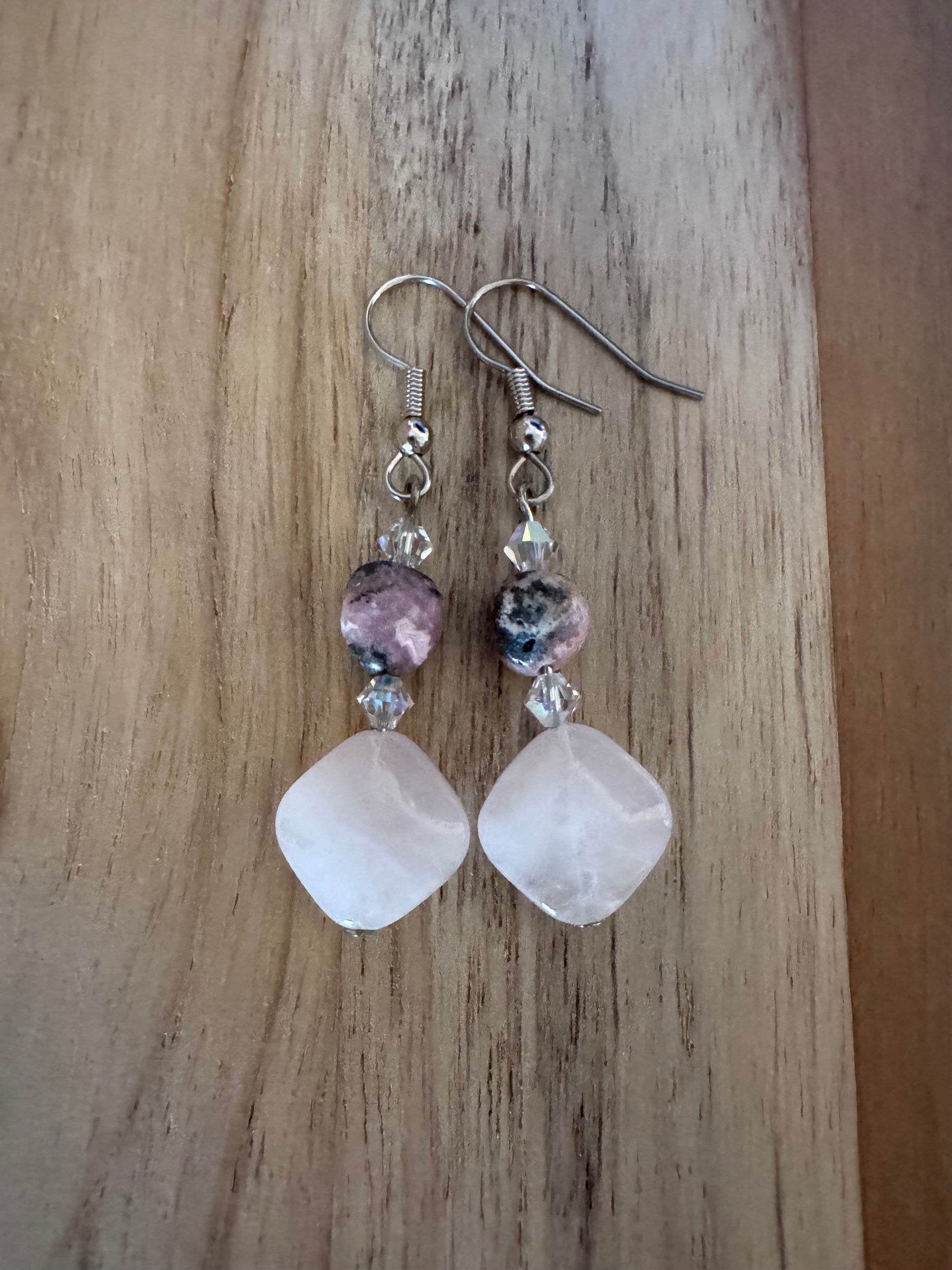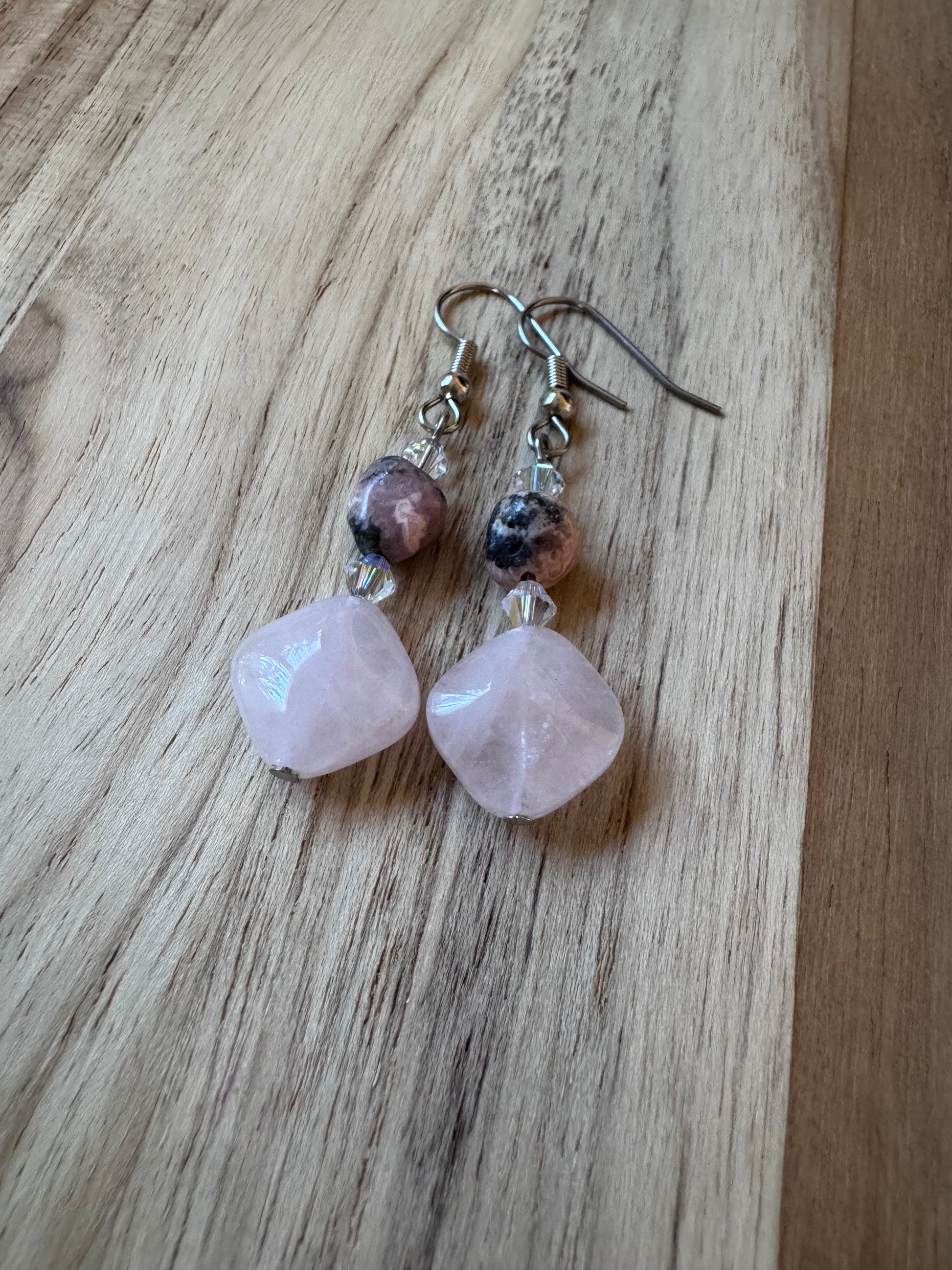 Rose Quartz and Rhodonite Dangle Earrings with Crystal Accents