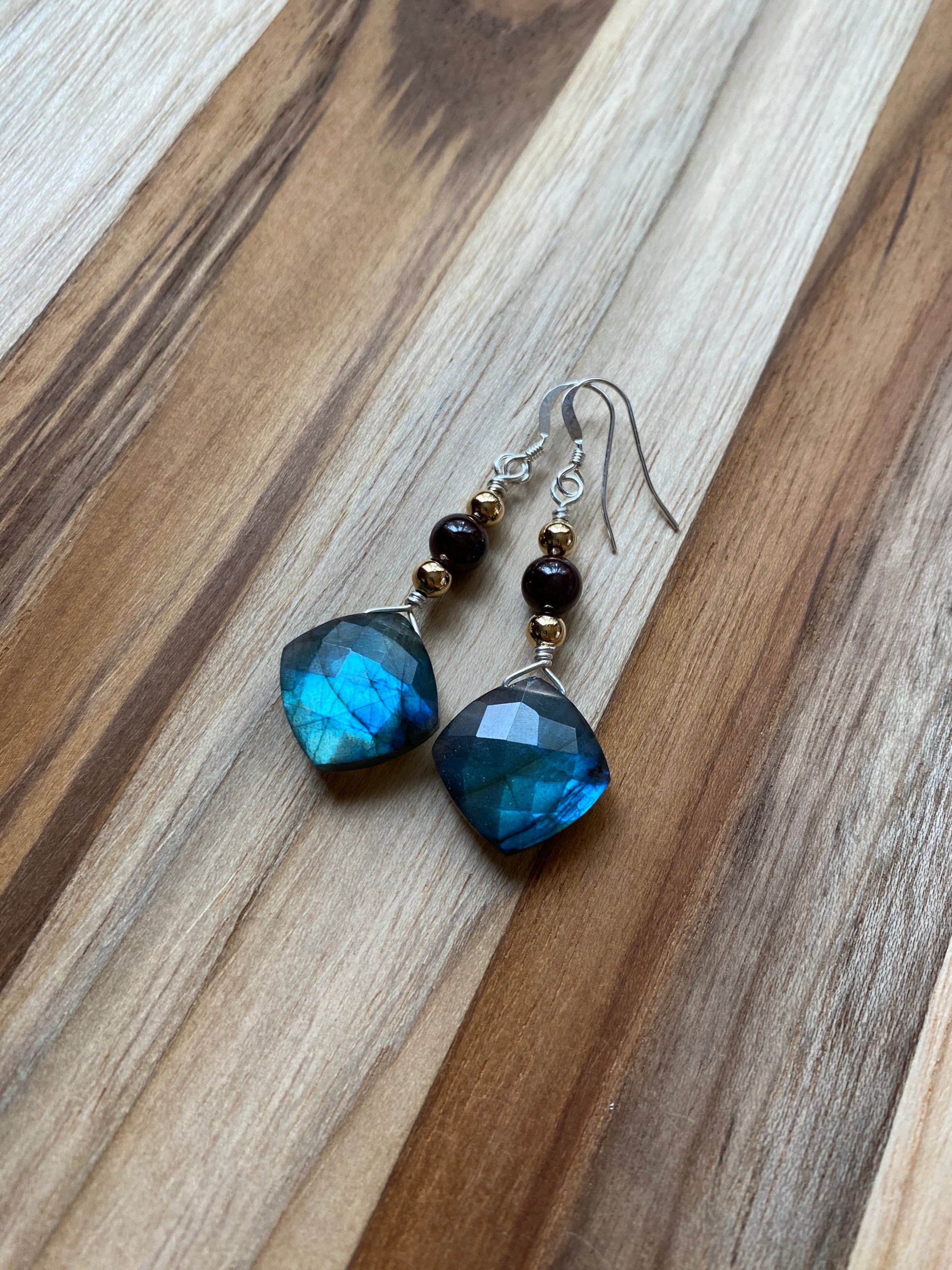 These earrings are stunning in person! Lots of gorgeous blue flash in these faceted labradorite stones. I have accented them with 6mm dark burgundy red garnet and 5mm gold filled beads. The earrings are wrapped with sterling silver wire and have sterling silver hooks.
