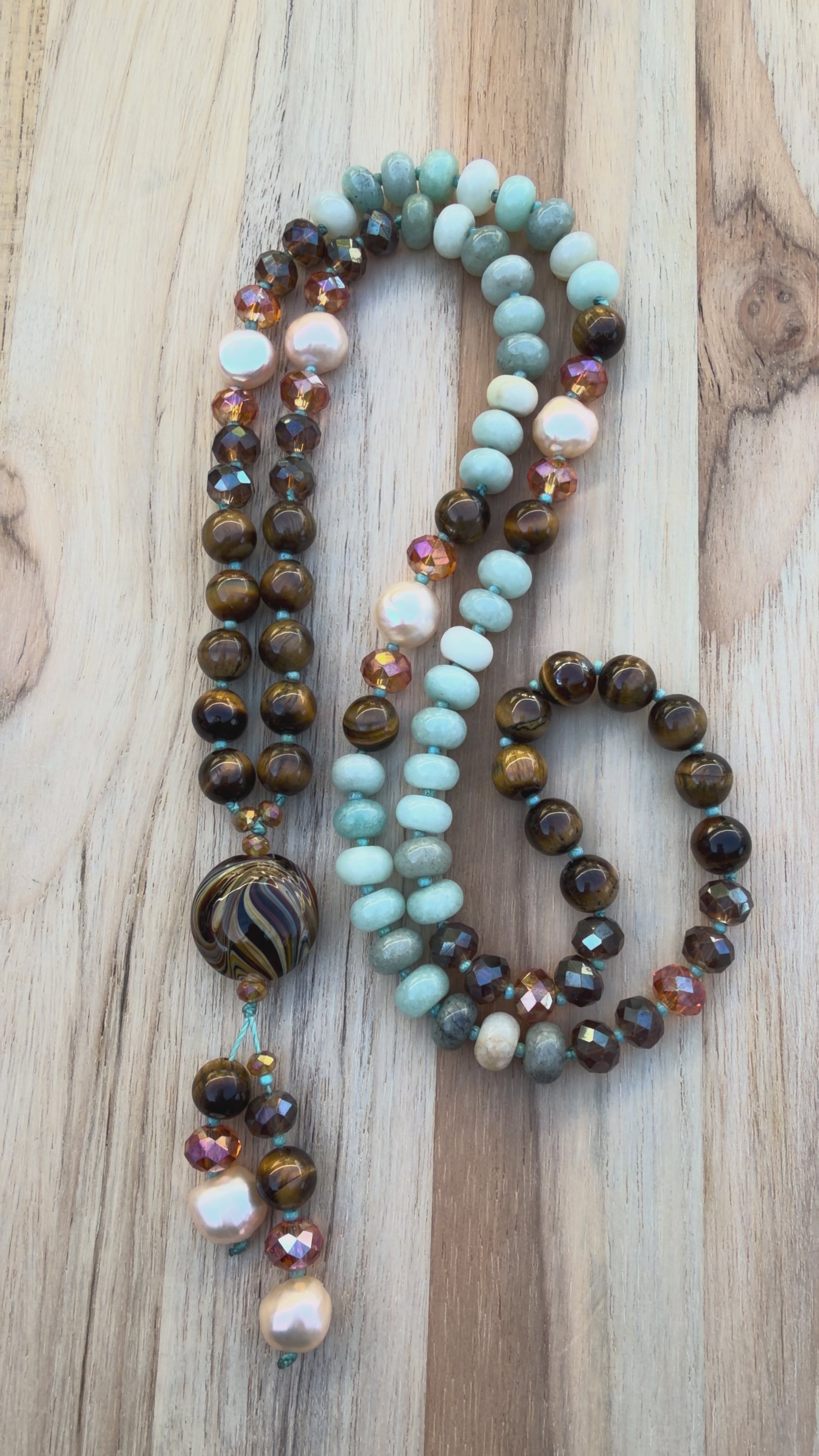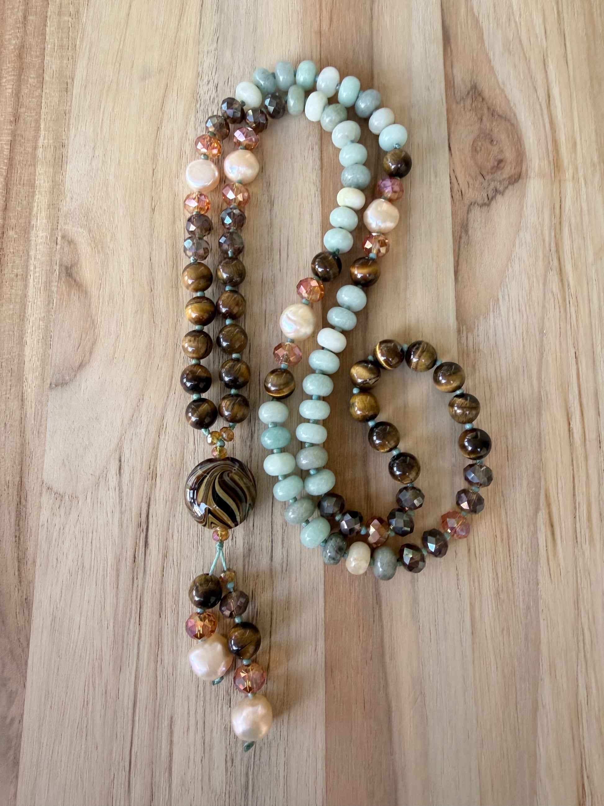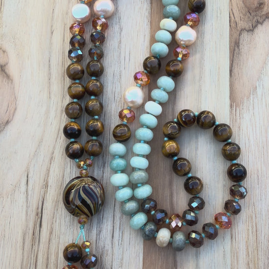 It is strung with 8mm tigereye smooth round beads, 8mm amazonite rindelles, and has pale peach freshwater pearl accents in a 9-10mm size. There are crystals throughout giving it a touch of sparkle that range between 4 & 8mm in size.