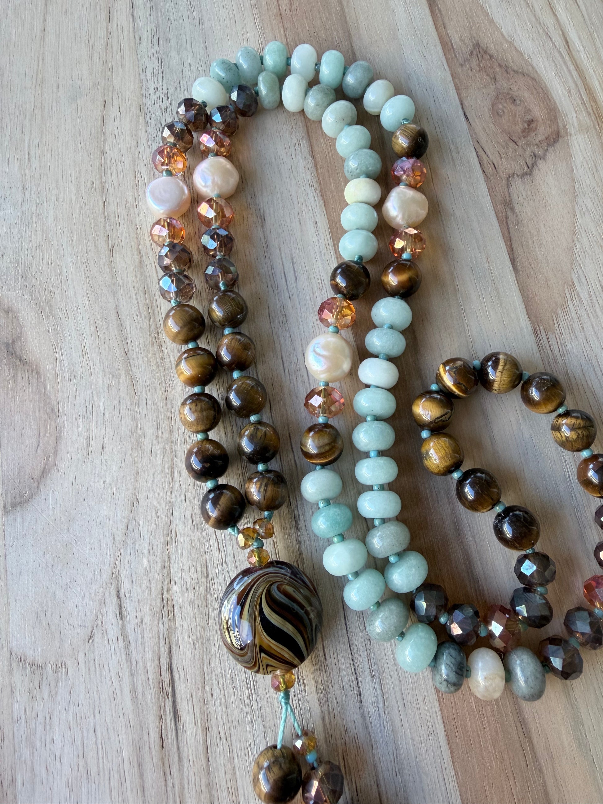 26” Long Art Glass Pendant Necklace with Tigereye Amazonite Pearl and Crystal Beads