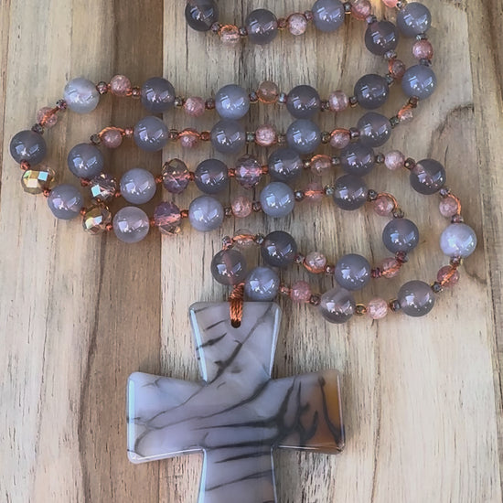 26” Long Carved Agate Cross Necklace with Grey Agate and Peach Strawberry Quartz Beads