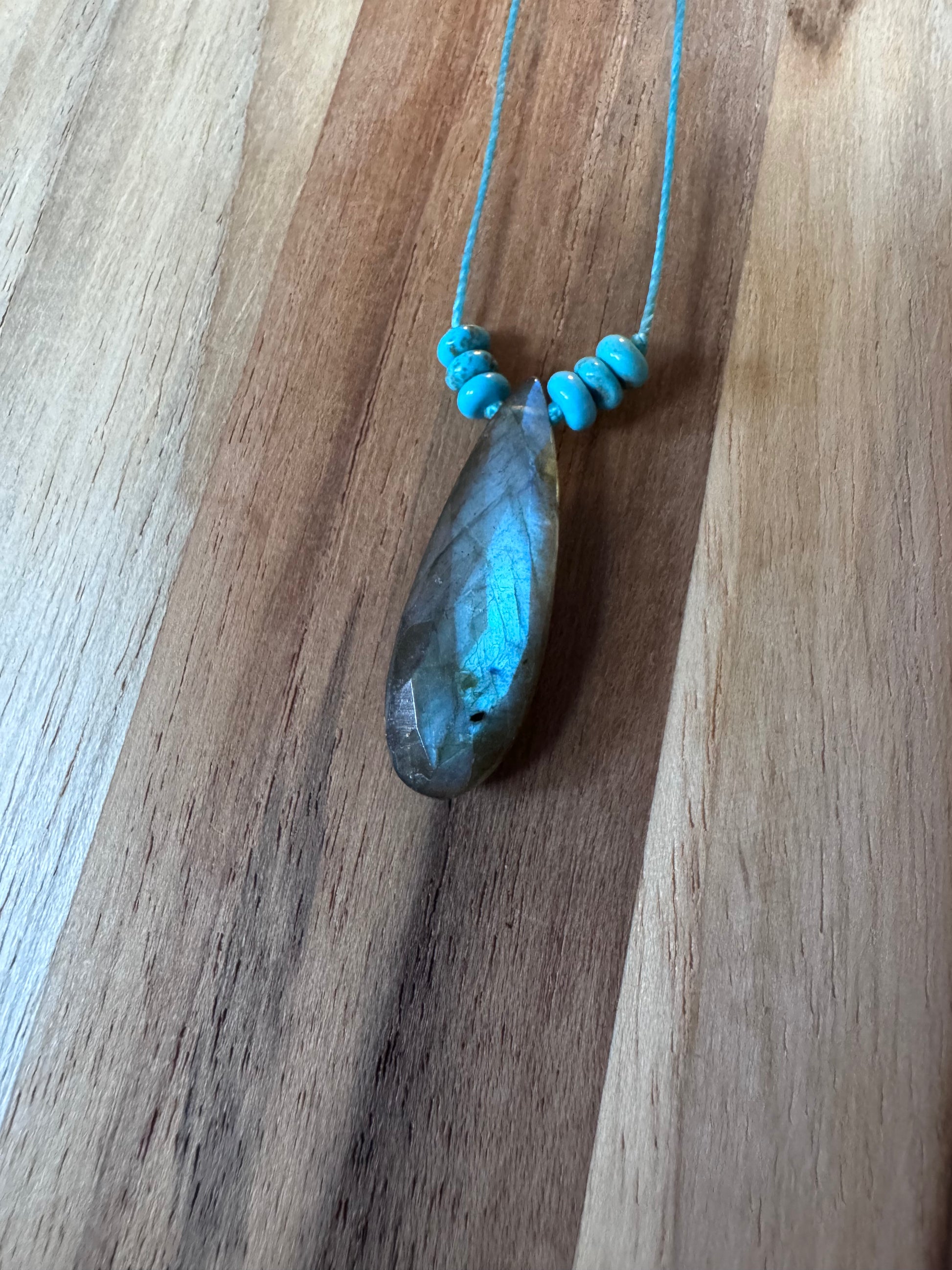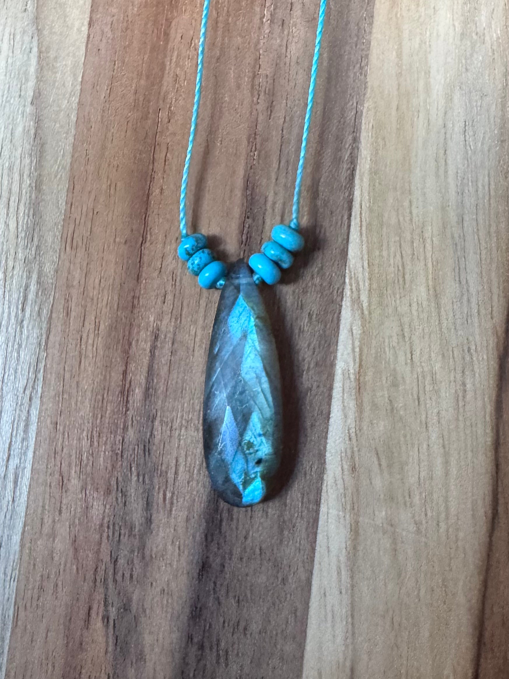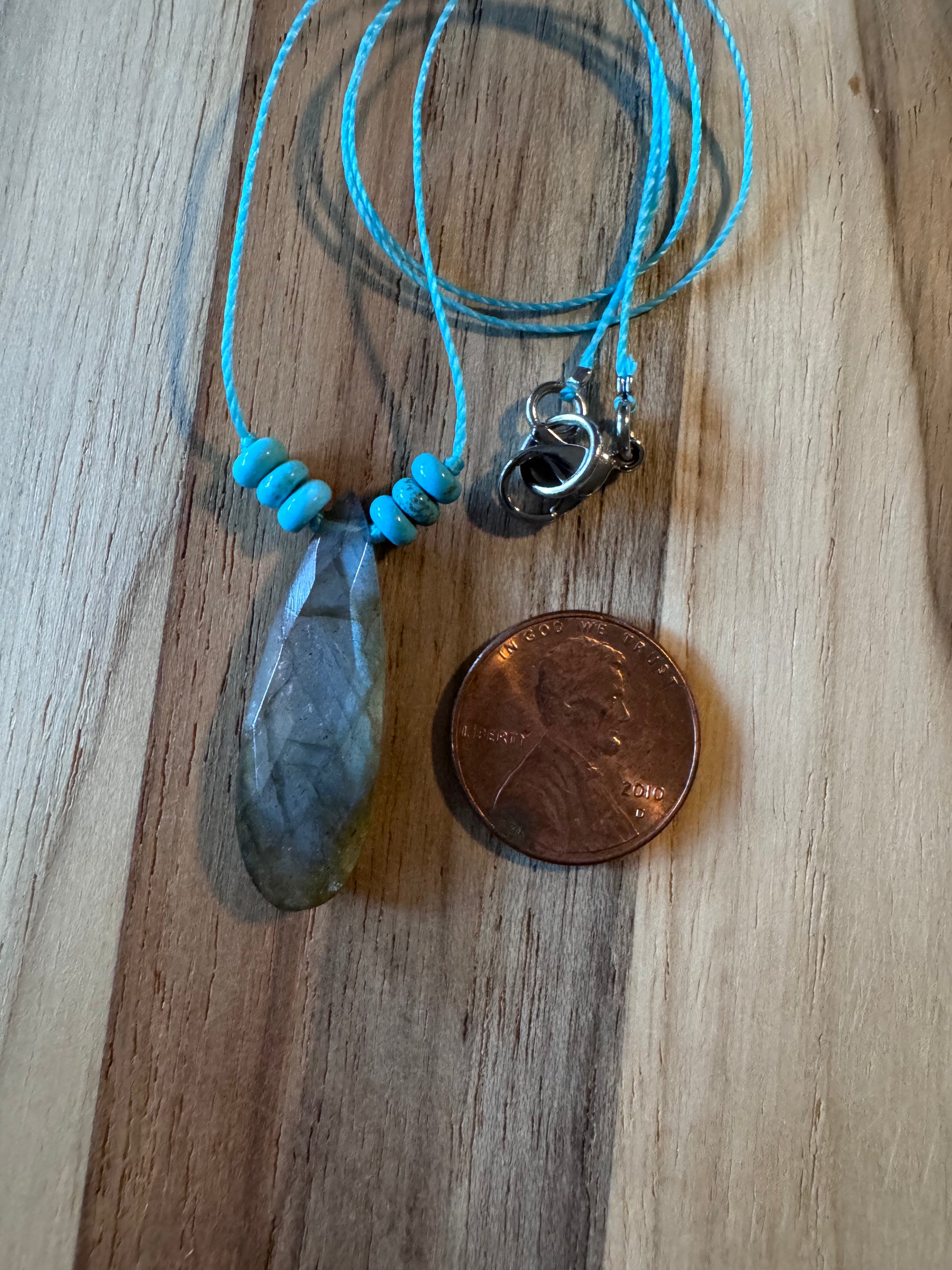Dainty faceted labradorite and Nevada turquoise floating pendant necklace with stainless steel clasp. The larger clasp balances out the pendant.