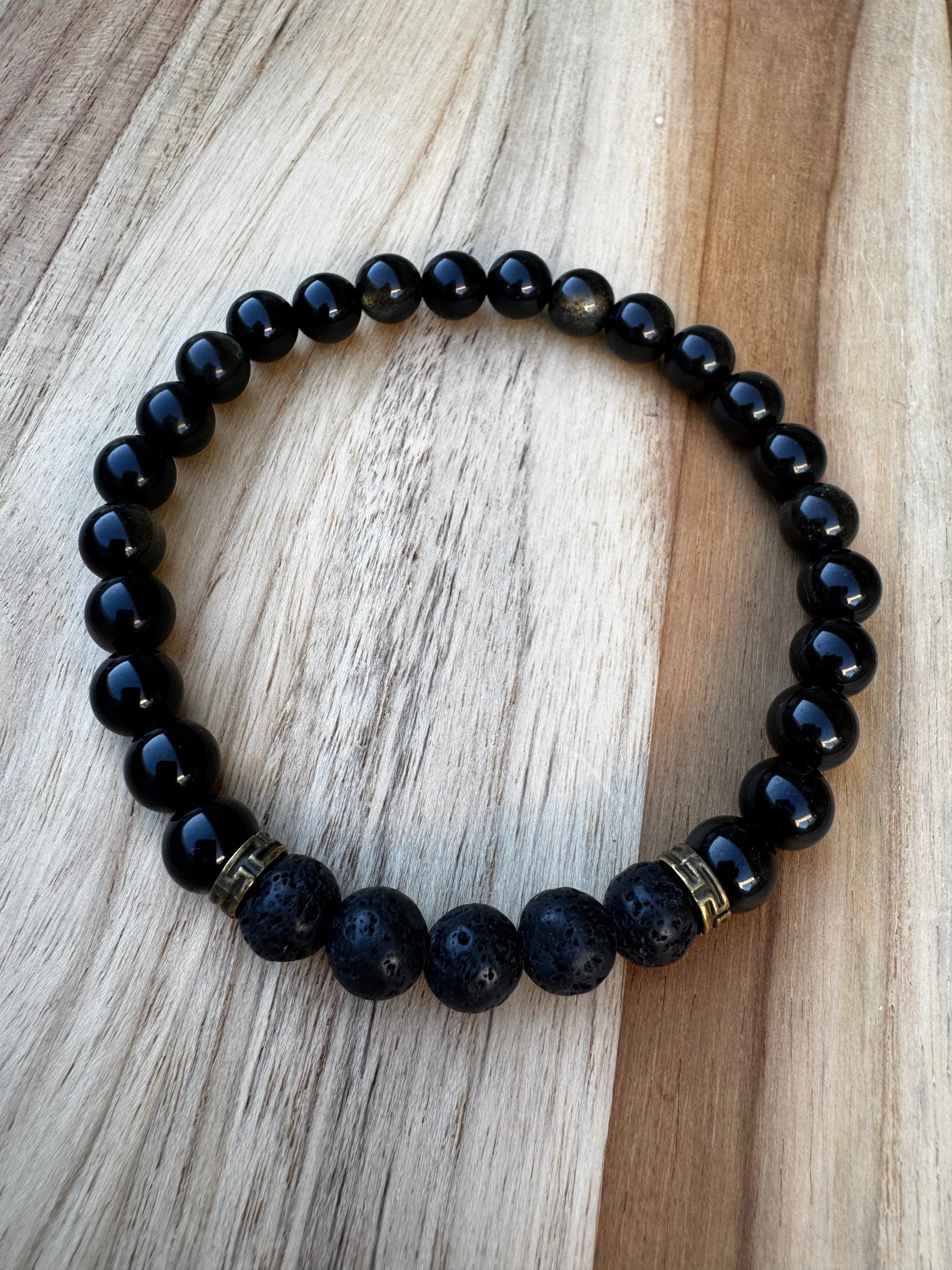Men’s Aromatherapy Stretch Bracelet with Gold Sheen Black Obsidian and Black Lava Stone ~ 9” Custom