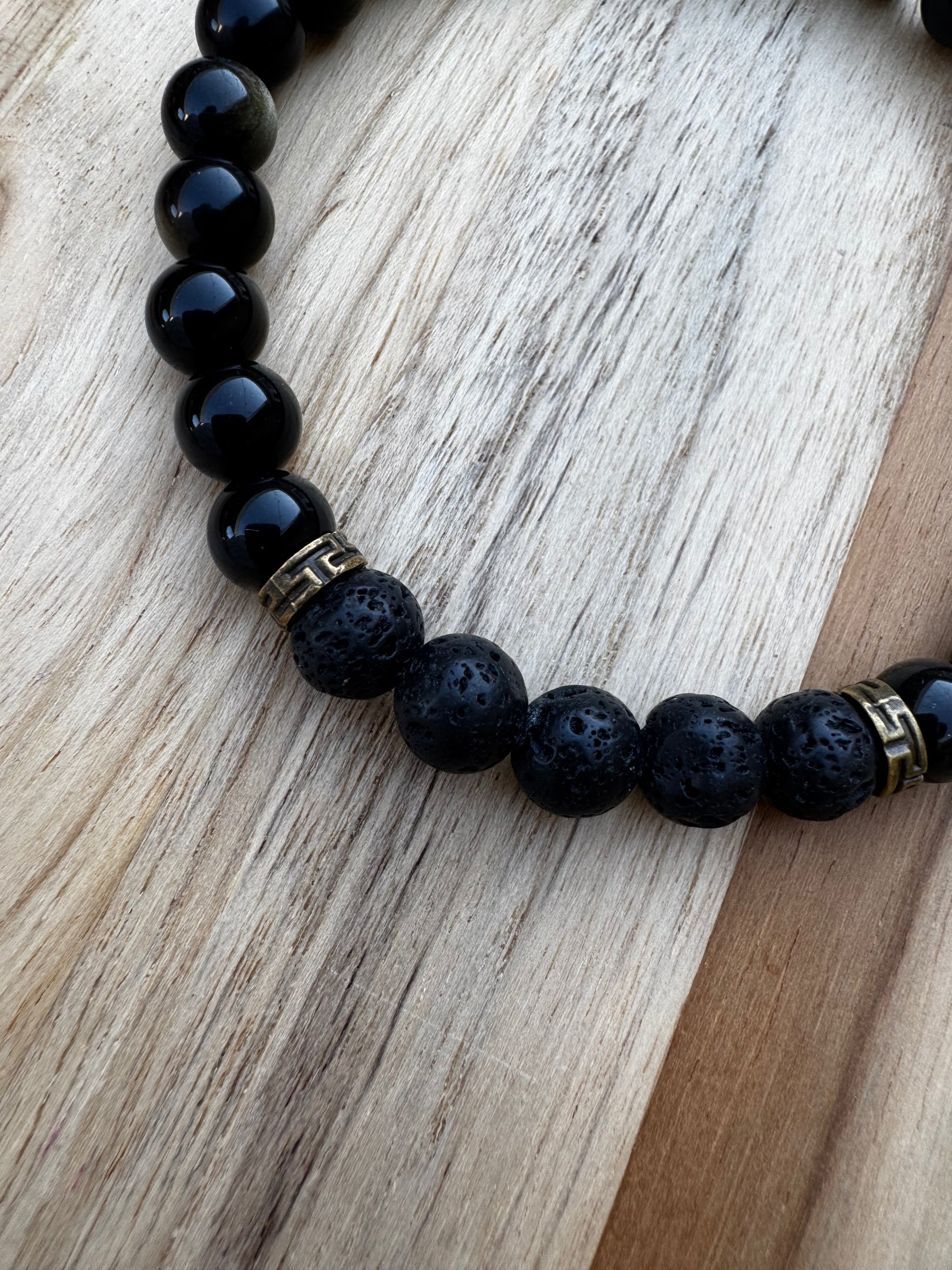 Beautiful custom 9” aromatherapy bracelet in 8mm gold sheen black obsidian, black lava stone and Greek key accent beads.