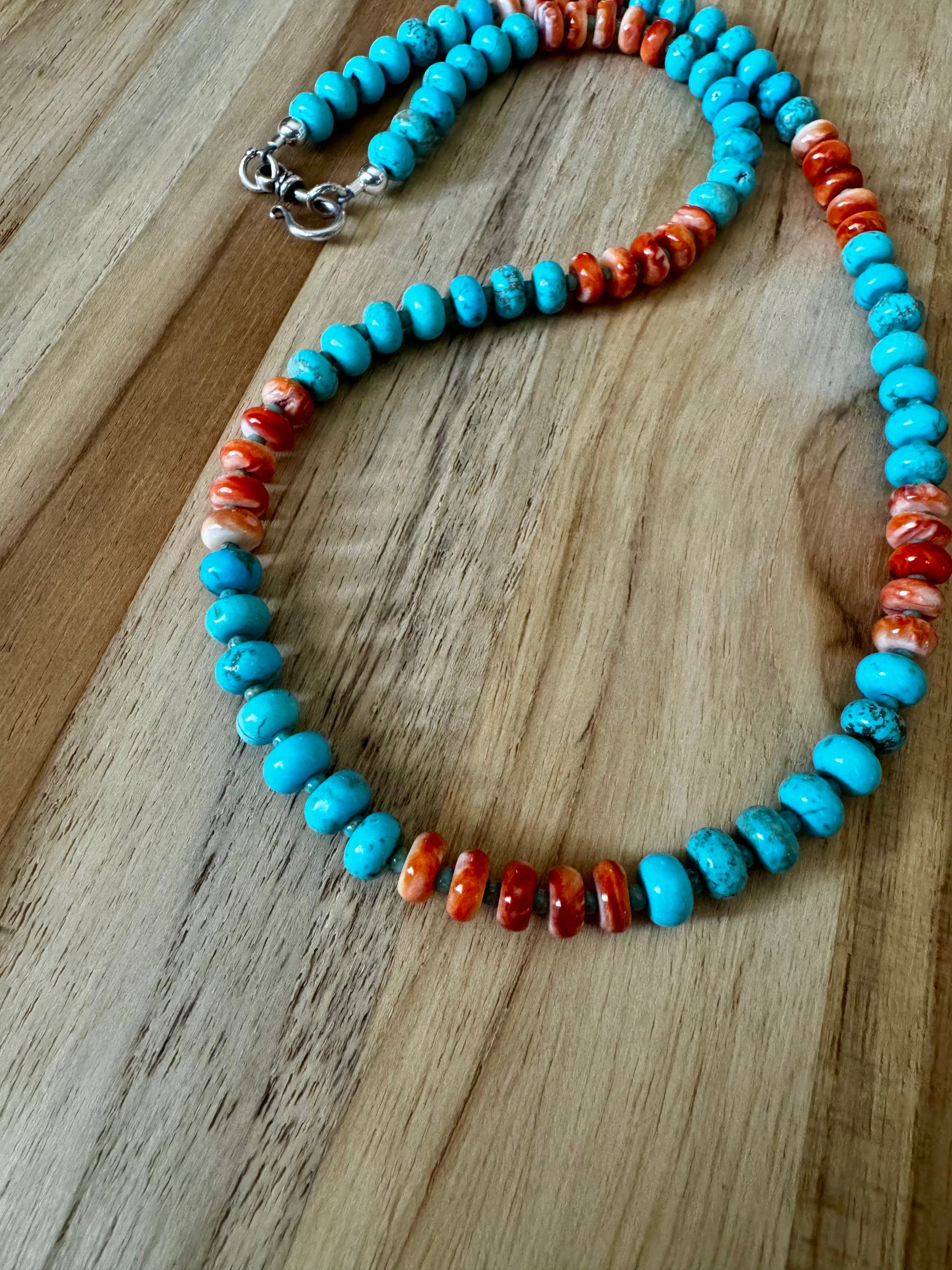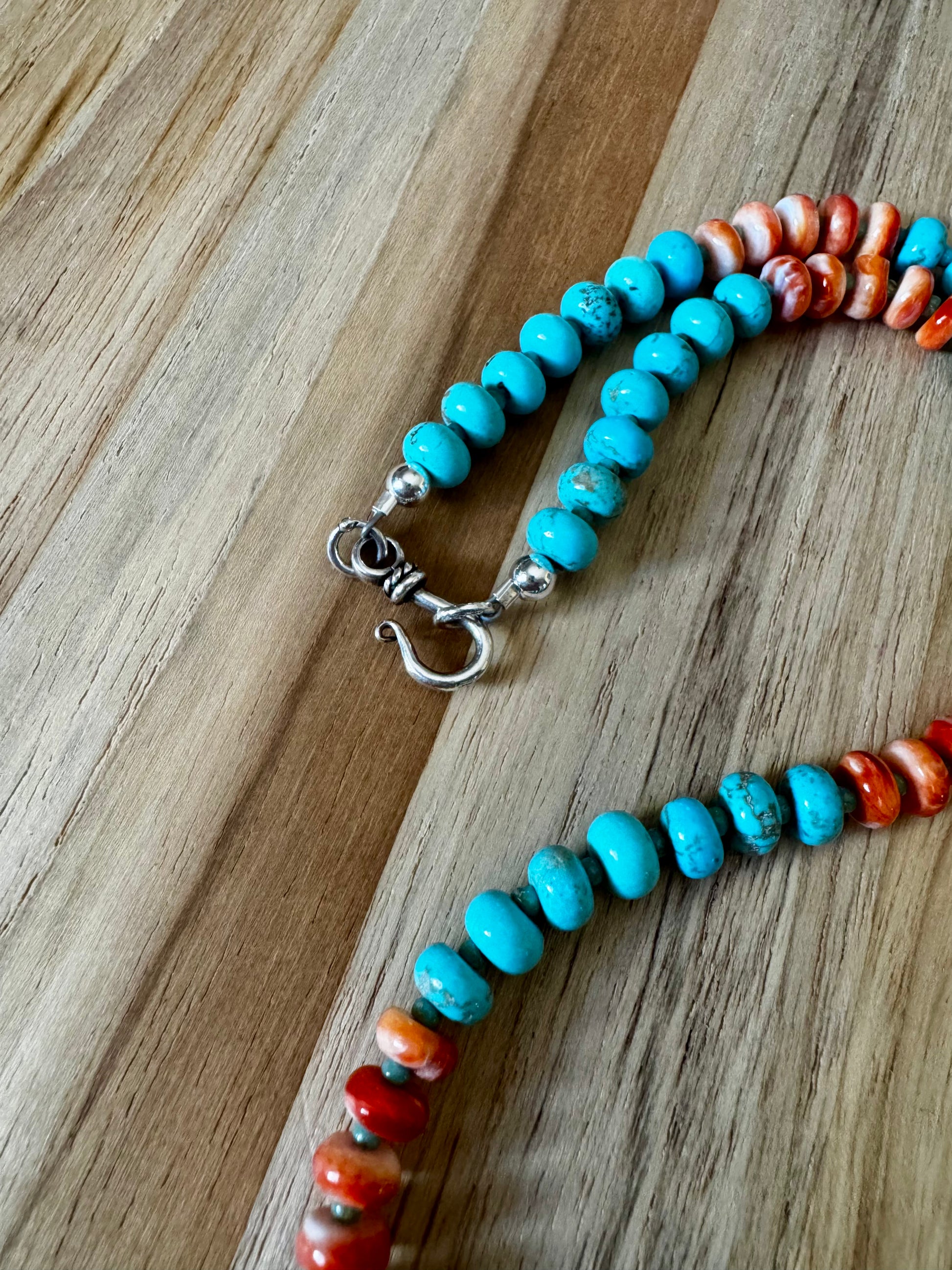 Nevada Blue Turquoise Beaded Necklace with Orange Spiny Oyster and Sterling Silver
